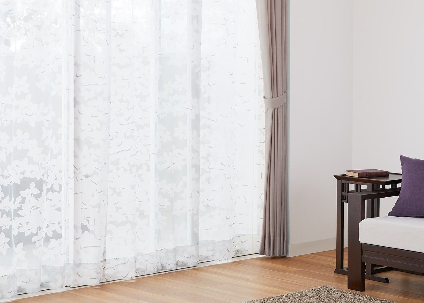 シックな雰囲気のドレープカーテンにリーフ柄のフォーレを合わせると、カーテンの開け閉めで印象の違いを楽しむことができます。(写真はホワイト ノンタック。