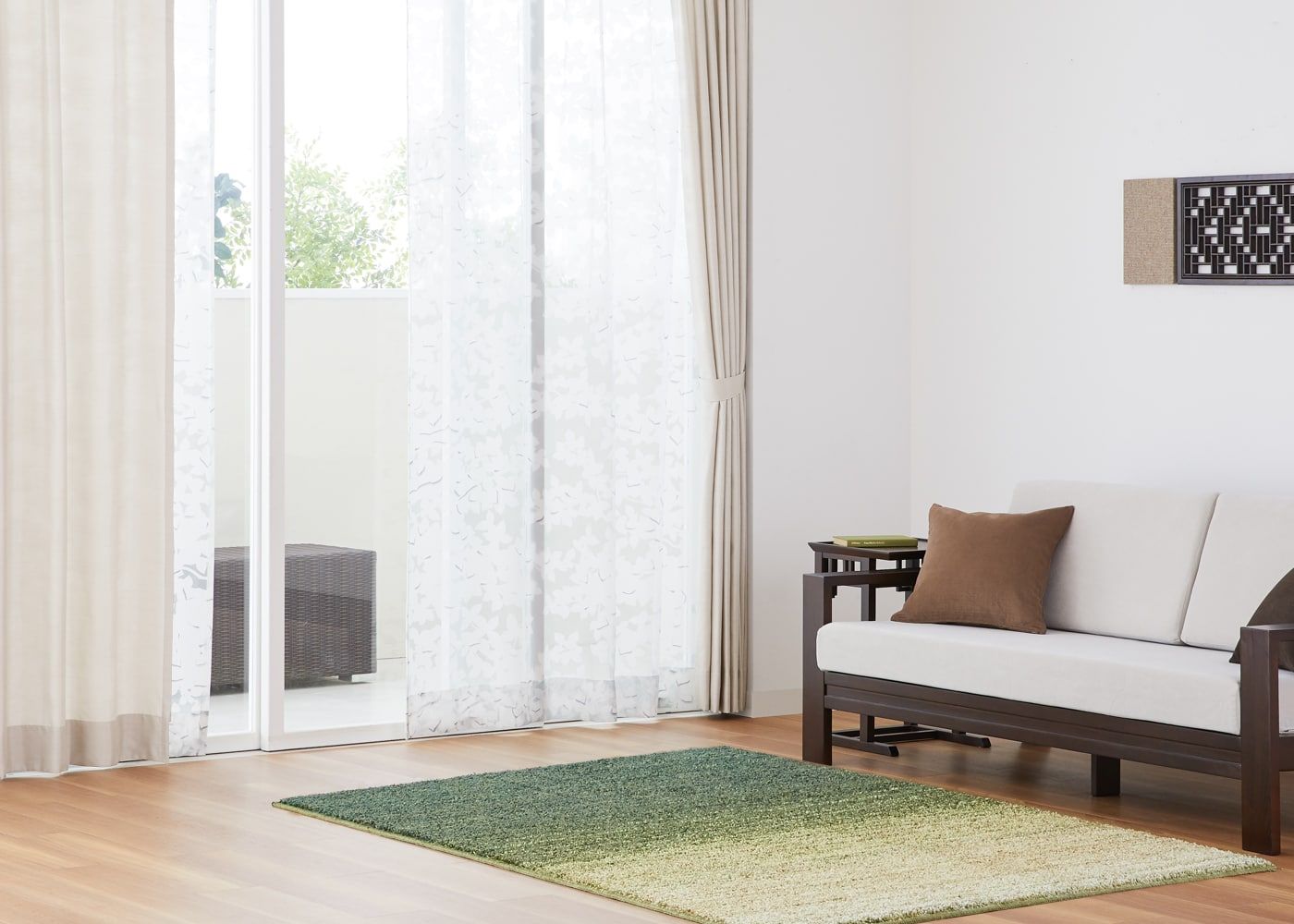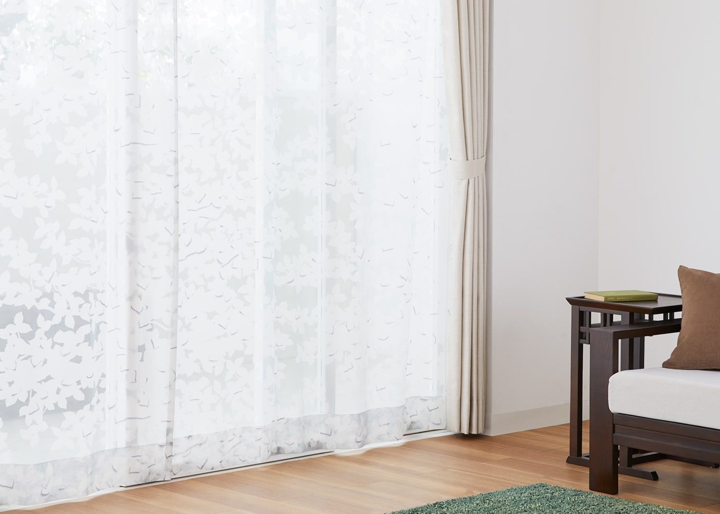 見る人の心を癒す「光の森」がデザインコンセプトのレースカーテン フォーレ。木々の葉をデザインしたカーテンに光が透過することで、リビング空間に木漏れ日をもたらしてくれます。(写真はホワイト ノンタック)