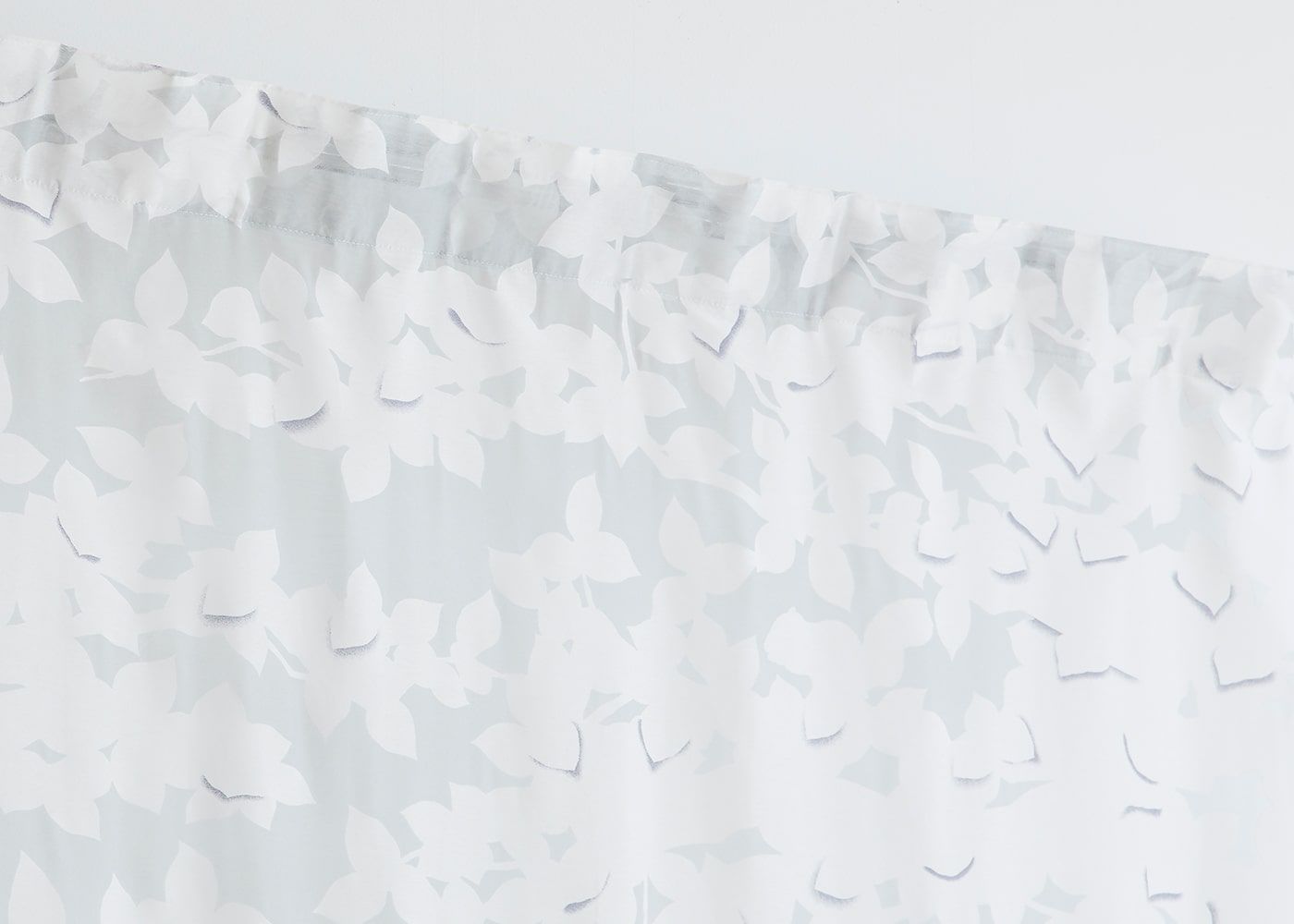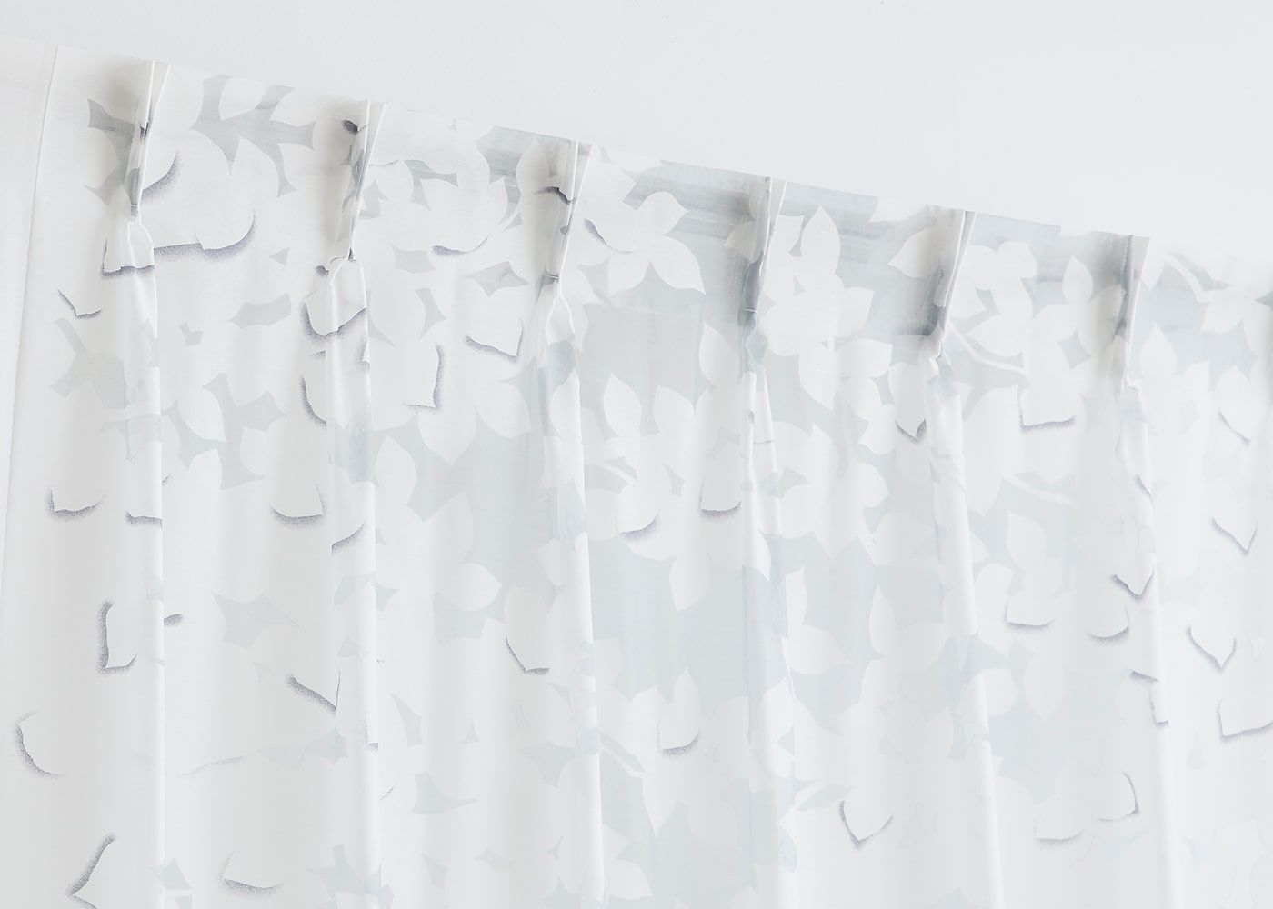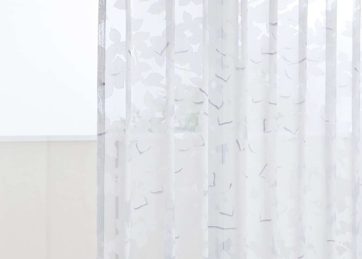 生地いっぱいに木々の葉を描いたフォーレ。普通のレースカーテンでは味わえない雰囲気が特長です。ご家庭での洗濯ができ、さらに防炎機能も備えたファブリックです。