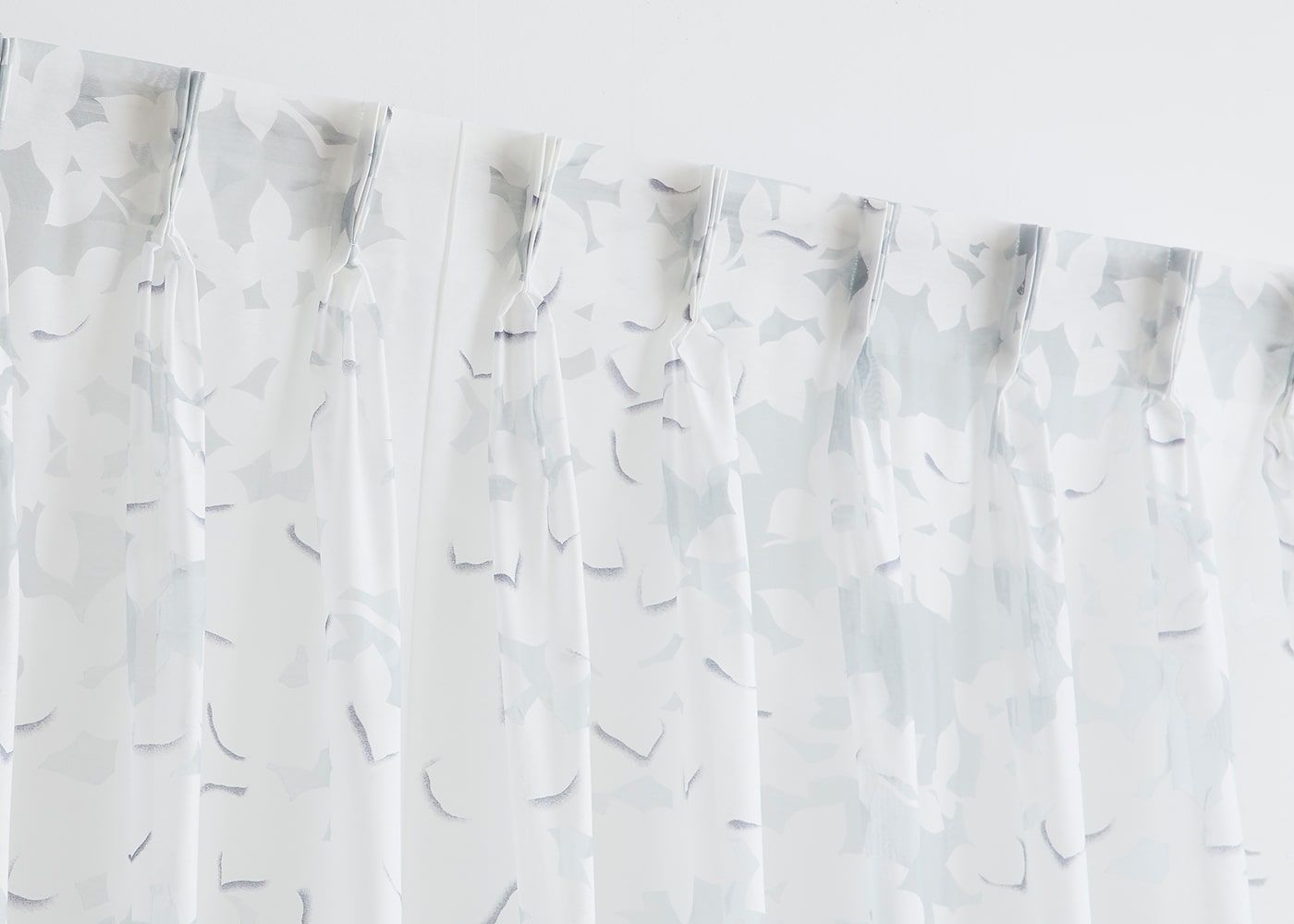 カーテンはプリーツ2倍ヒダ、1.5倍ヒダ、ノンタックの3種類。プリーツ2倍ヒダは、生地を贅沢に使いボリューム感と高級感を演出。ヒダによる空気の層で保温・断熱効果も期待できます。(写真はホワイト プリーツ2倍ヒダ)