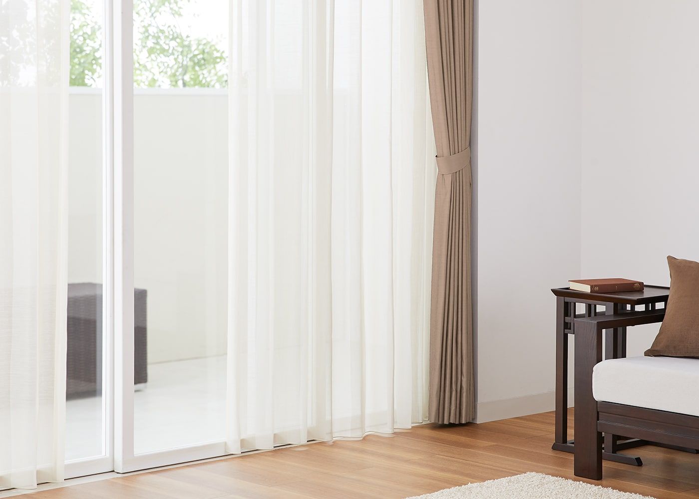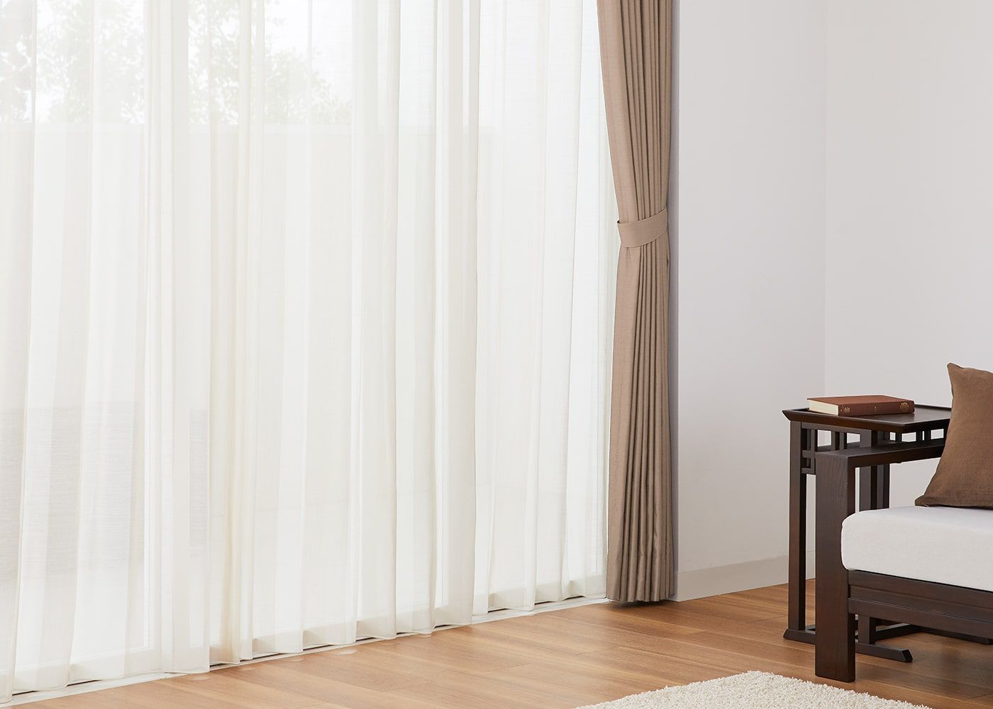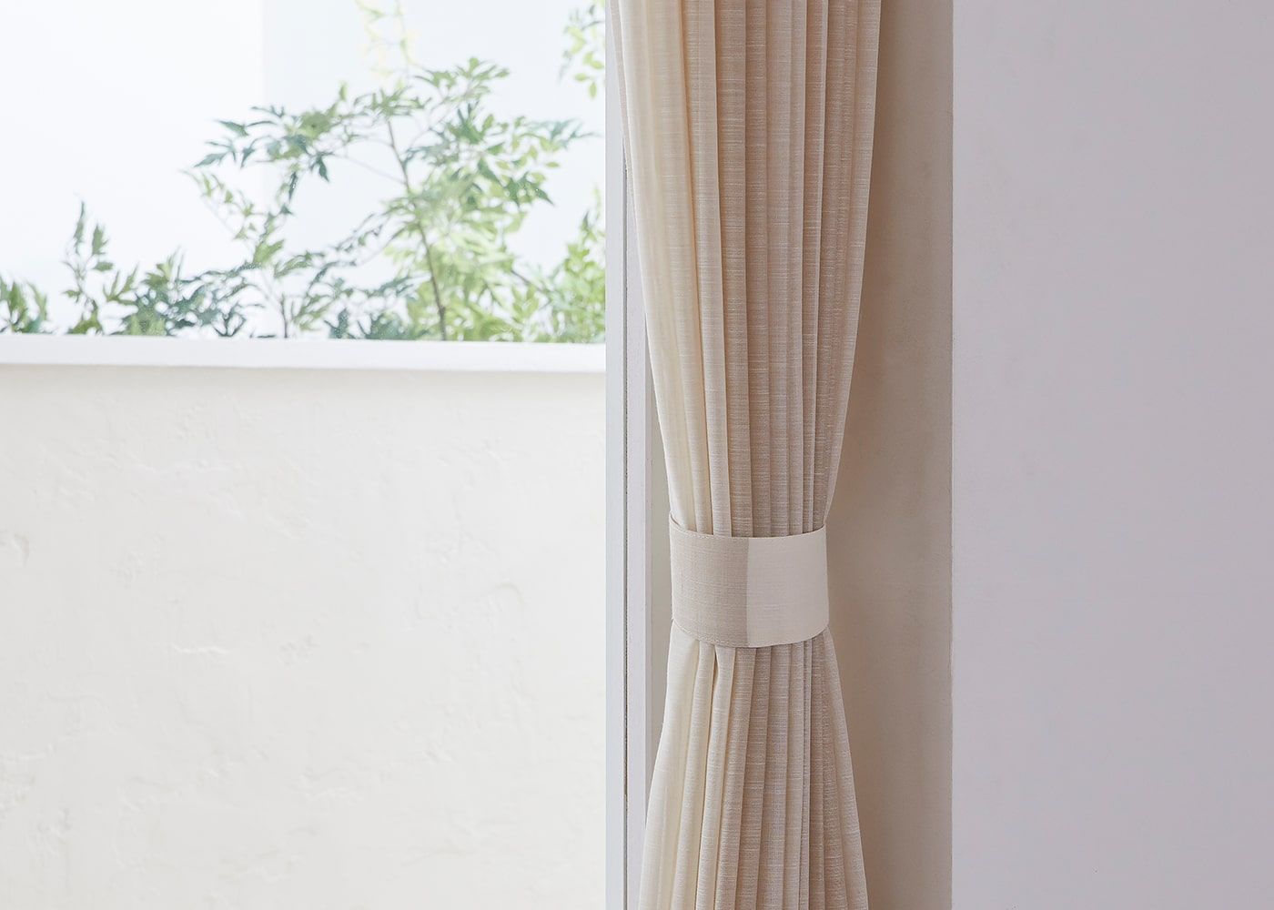 ノンタックは、レール巾に近い長さの生地を使用してヒダを作らない、どんな空間にも合わせやすいシンプルな雰囲気が魅力。使用生地が少ないため、一番リーズナブルにオーダーカーテンが作れます。ファブリックの表情や柄を活かしたコーディネートをしたい方やフラットな見た目にしたい方におすすめです。(写真はベージュ ノンタック)