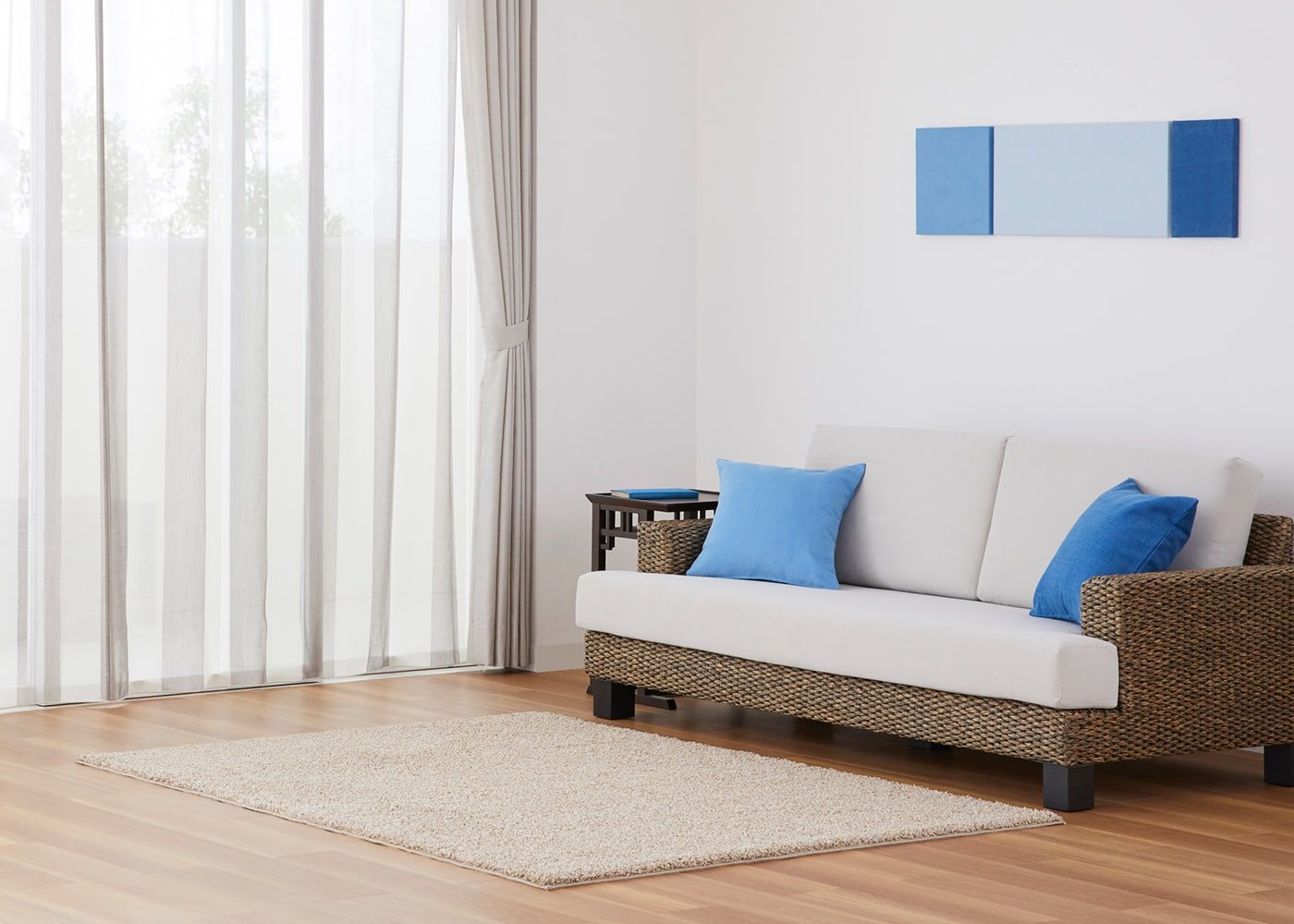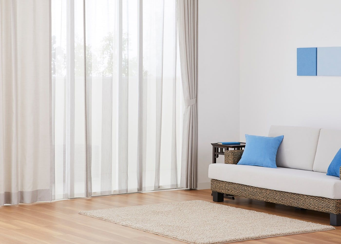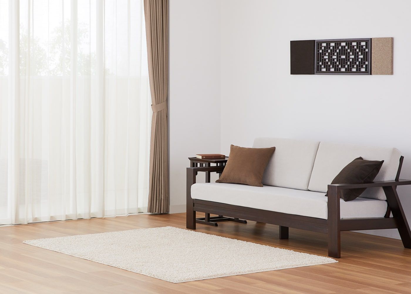 ノンタックは、レール巾に近い長さの生地を使用してヒダを作らない、どんな空間にも合わせやすいシンプルな雰囲気が魅力。使用生地が少ないため、一番リーズナブルにオーダーカーテンが作れます。ファブリックの表情や柄を活かしたコーディネートをしたい方やフラットな見た目にしたい方におすすめです。(写真はベージュ ノンタック)