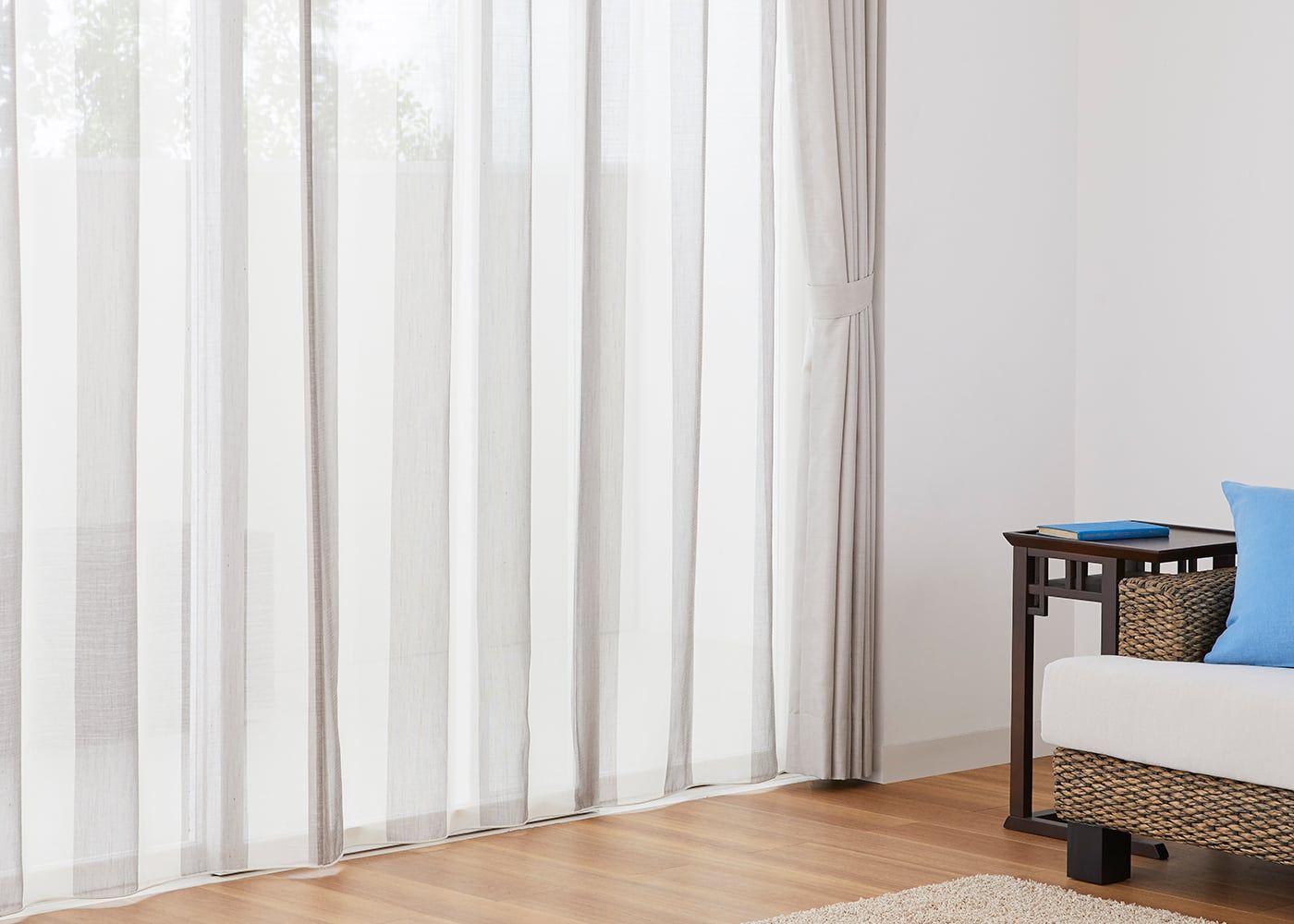 レースカーテンの有無で外の見え方の違いが一目でわかります。ストライプ柄のレースを取り入れて、一味違った雰囲気のリビングを演出してみては。(写真はベージュ プリーツ1.5倍ヒダ。