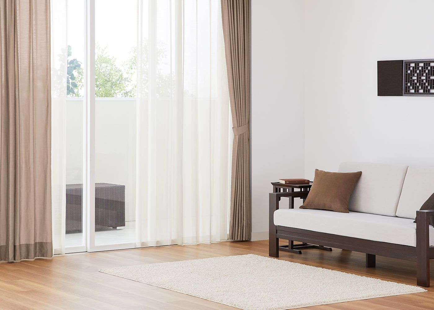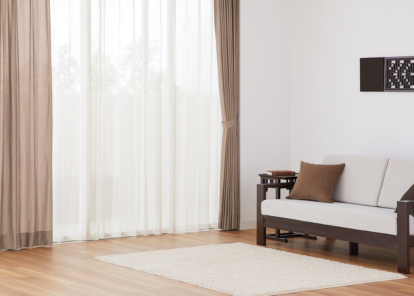 壁面装飾が主役のシックなアジアンコーディネートのベースカラーとして活躍します。(写真はベージュ プリーツ1.5倍ヒダ)