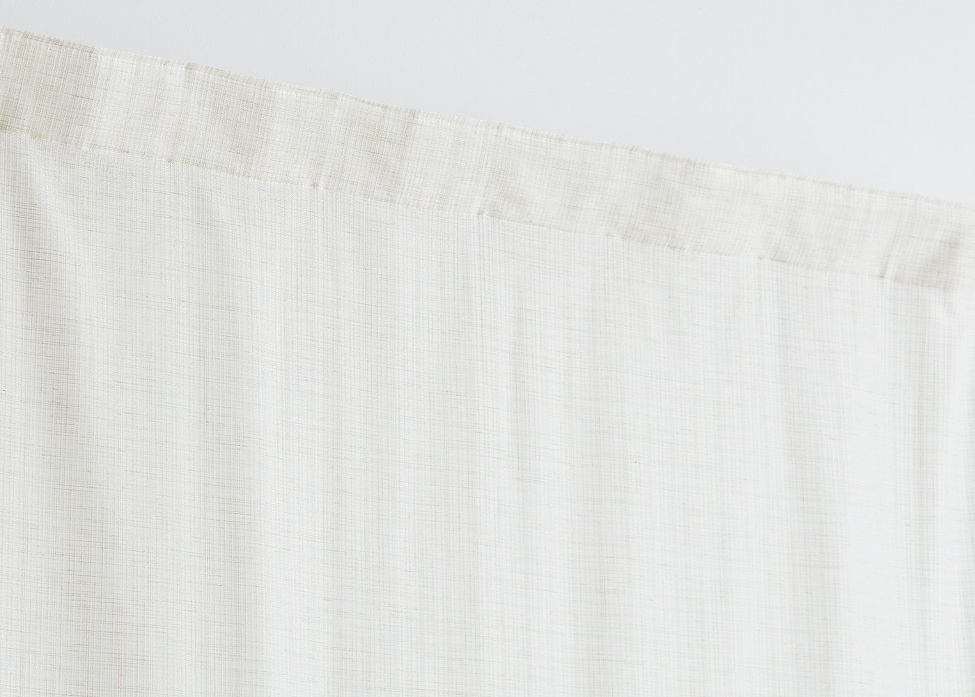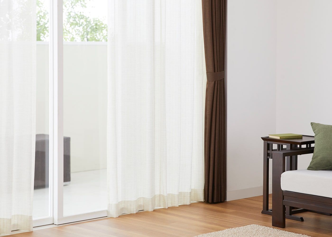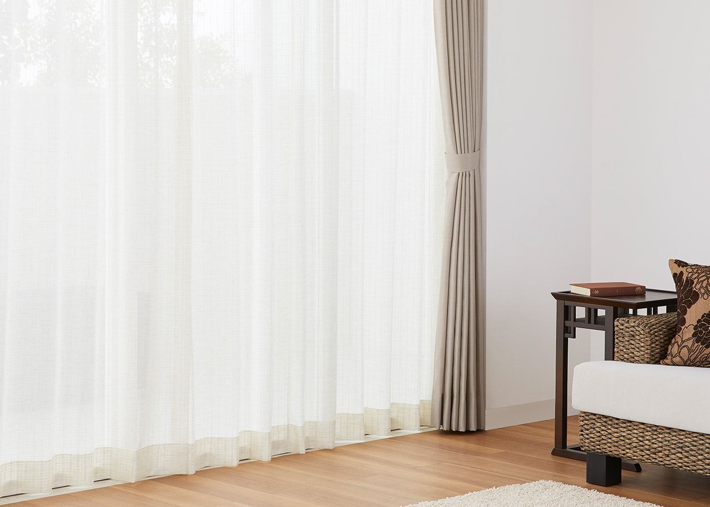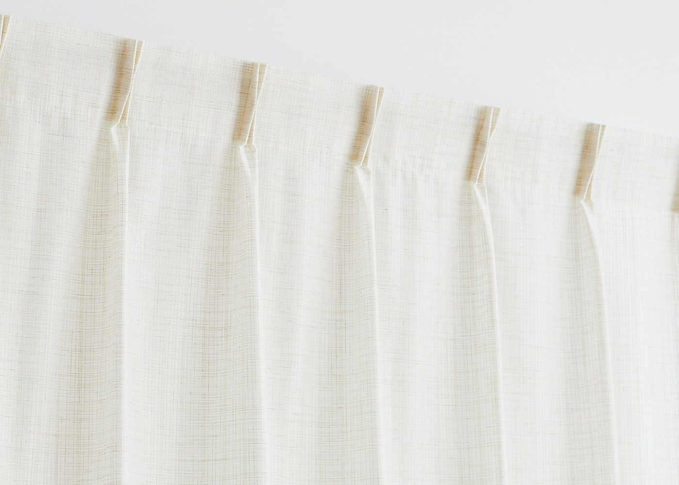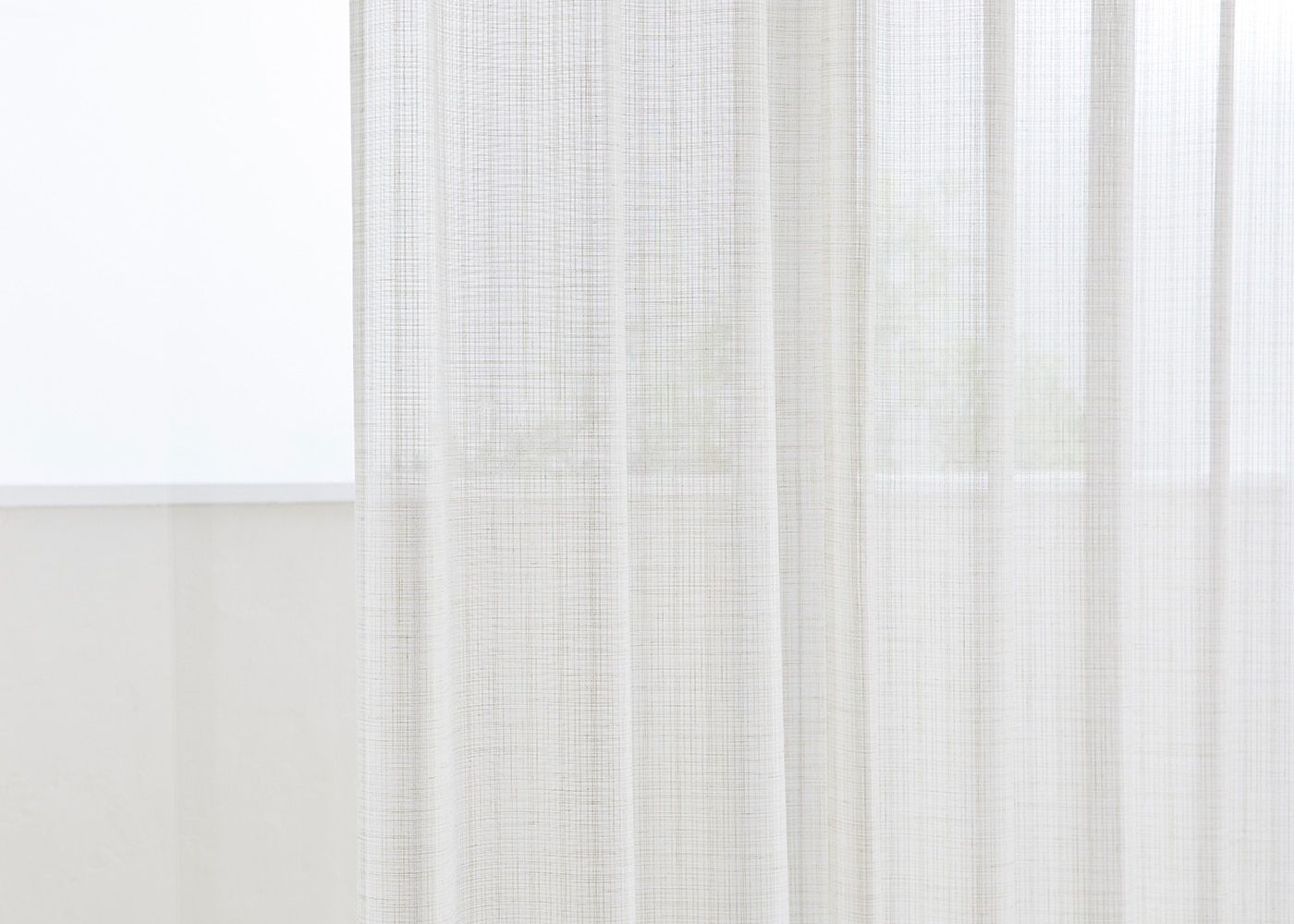 天然素材を思わせる質感とミラー加工や遮熱などの機能性が魅力のレースカーテン ナチュラ。ざっくりとした織目とナチュラルな色みが空間に温もりをあたえてくれます。(写真はホワイト プリーツ1.5倍ヒダ)