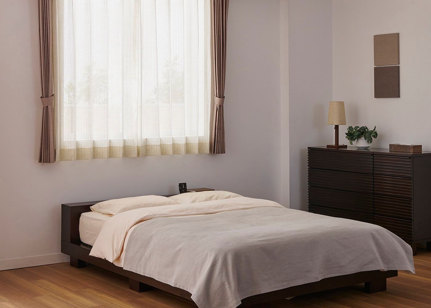 視線を遮るミラー加工や遮熱機能が付いたナチュラは、寝室のカーテンにも最適です。大切なプライバシーを守りながら寝室を快適かつ、おしゃれに演出できます。(写真はホワイト プリーツ1.5倍ヒダ)