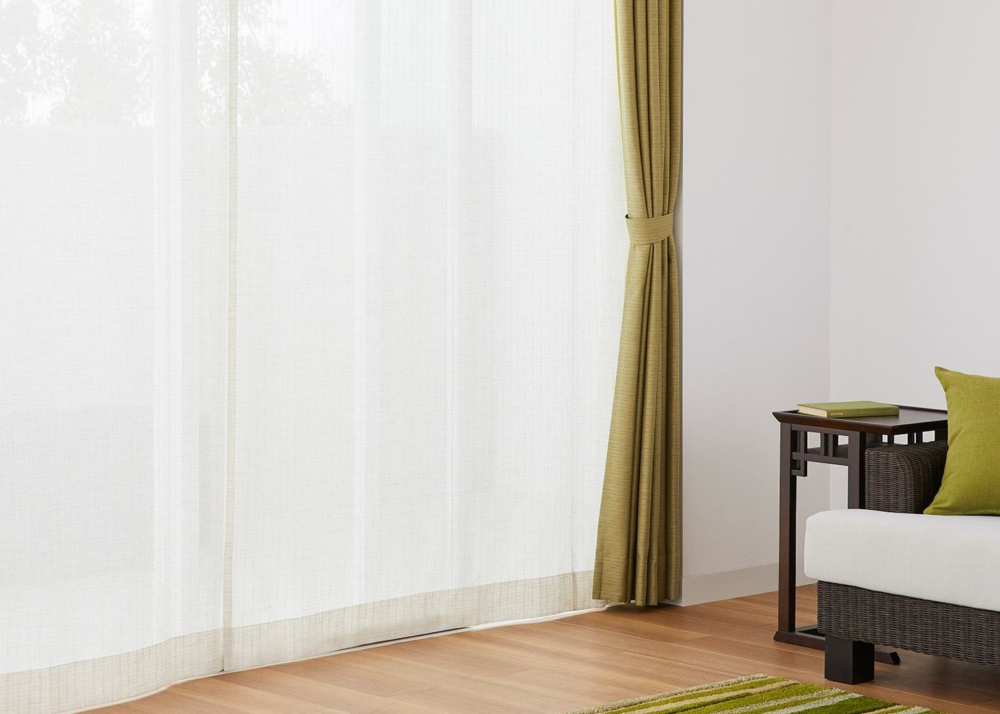 素材感のあるレースカーテンに穏やかなグリーン系のドレープカーテンを合わせると、よりナチュラルな雰囲気を楽しめます。(写真はホワイト ノンタック。