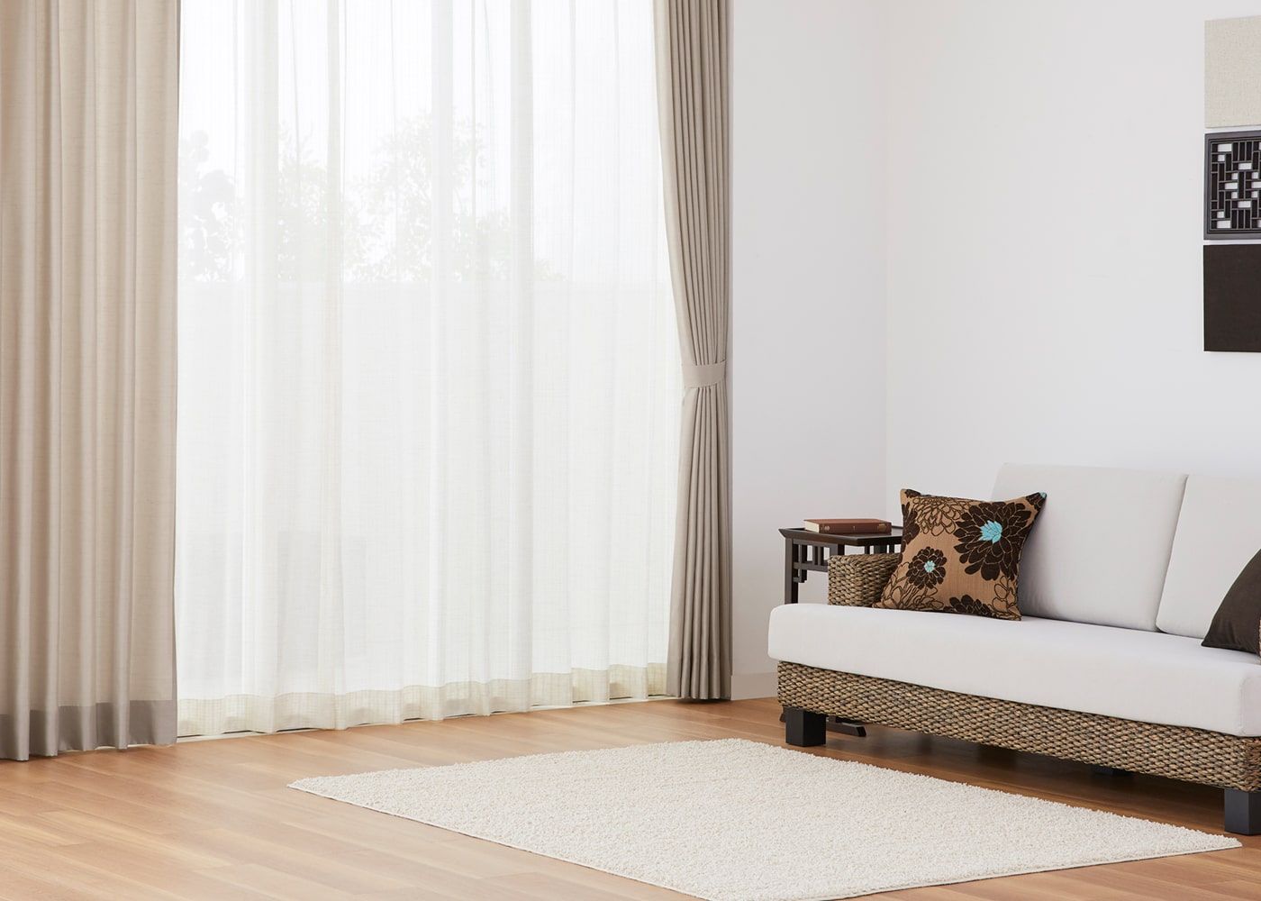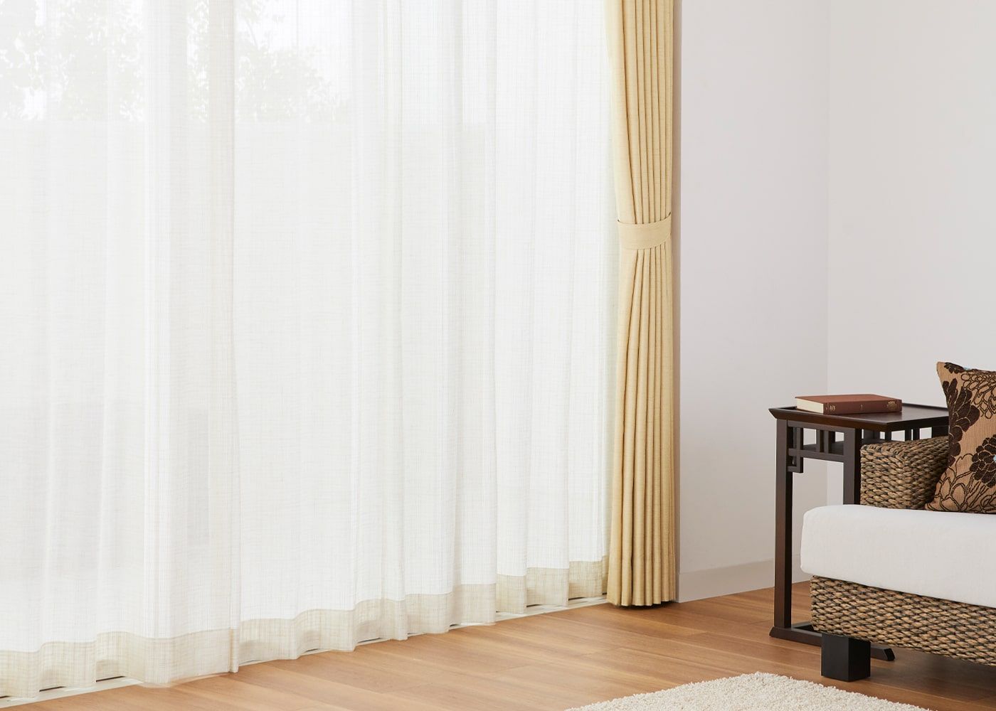 どんなコーディネートにも合わせやすい、ナチュラルな色のレースカーテンは、空間を明るくやさしいイメージに変えてくれます。(写真はホワイト プリーツ1.5倍ヒダ)
