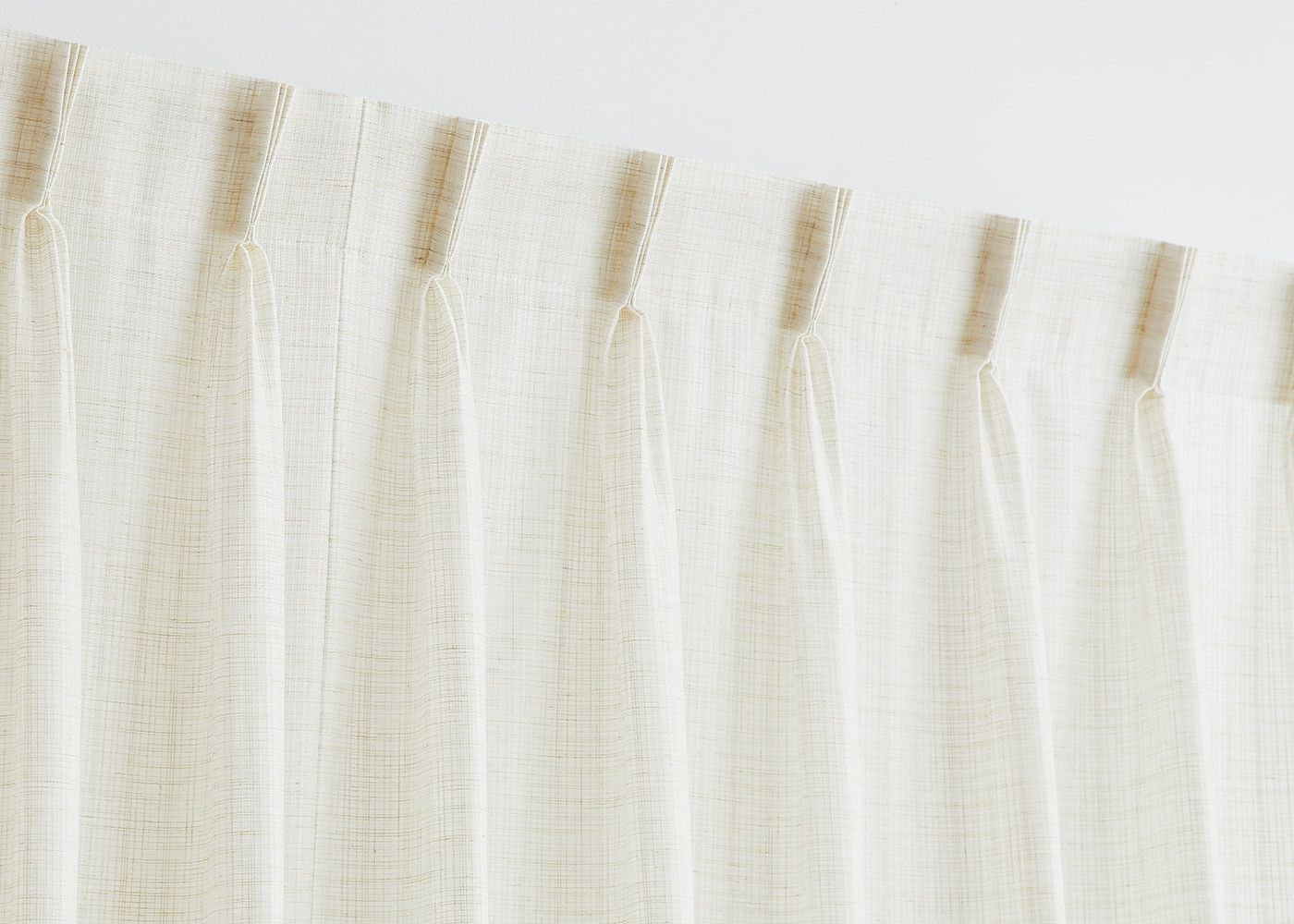 カーテンはプリーツ2倍ヒダ、1.5倍ヒダ、ノンタックの3種類。プリーツ2倍ヒダは、生地を贅沢に使いボリューム感と高級感を演出。ヒダによる空気の層で保温・断熱効果も期待できます。(写真はホワイト プリーツ2倍ヒダ)