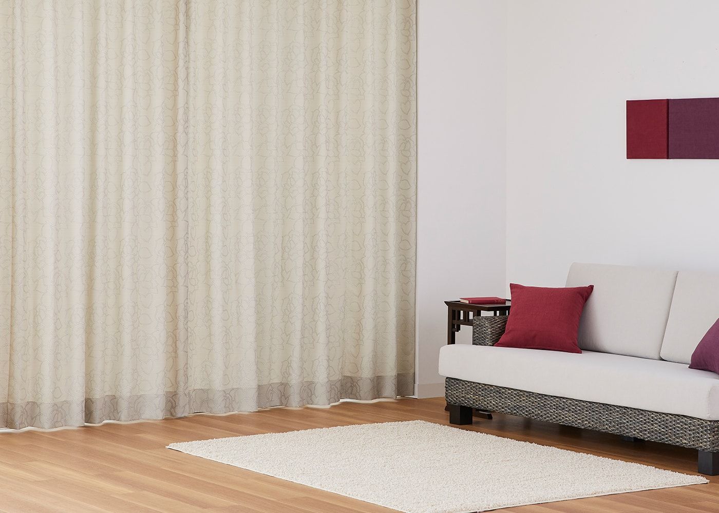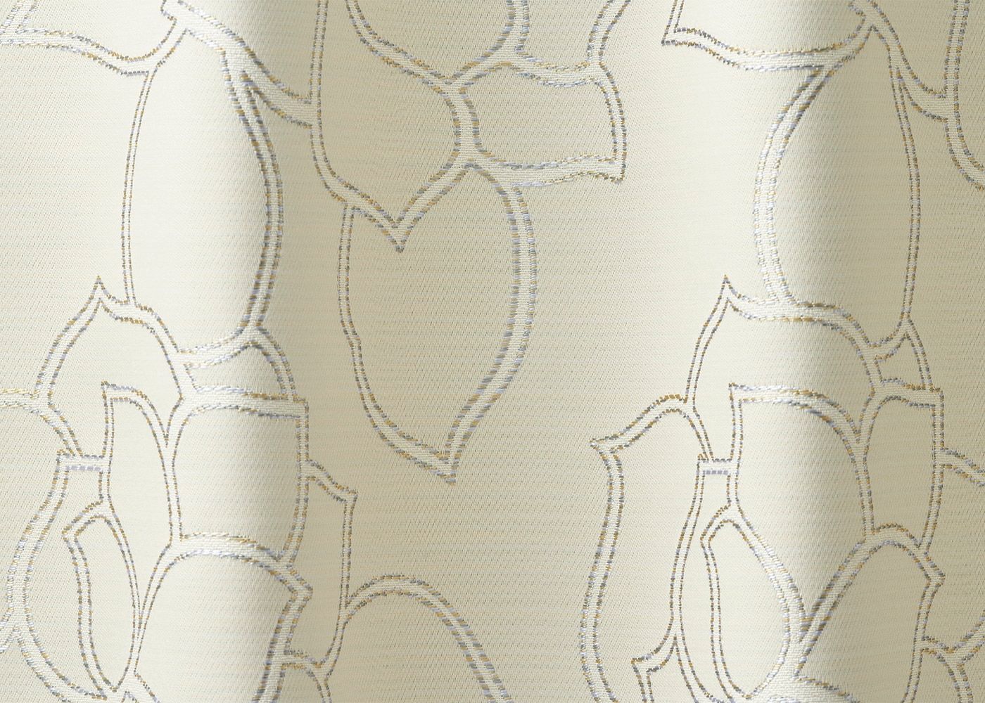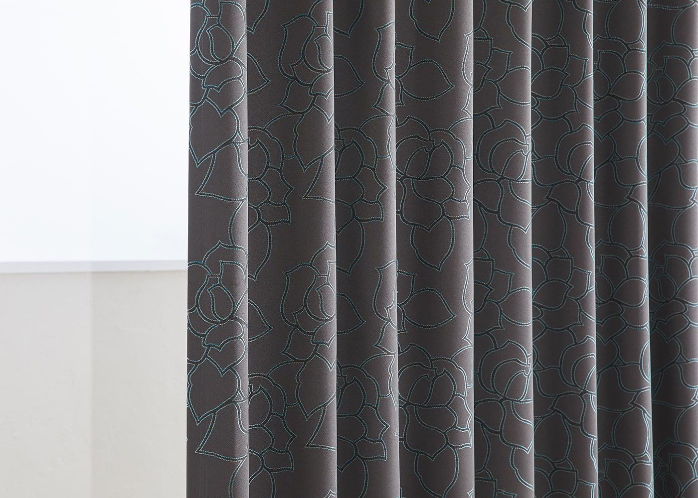 ラインデザインで描いた「バラの花」がお部屋を優雅に彩るドレープカーテン ルート。シックな印象のグレーと明るいイメージのナチュラルの2色展開のカーテンです。(写真はグレー ノンタック)