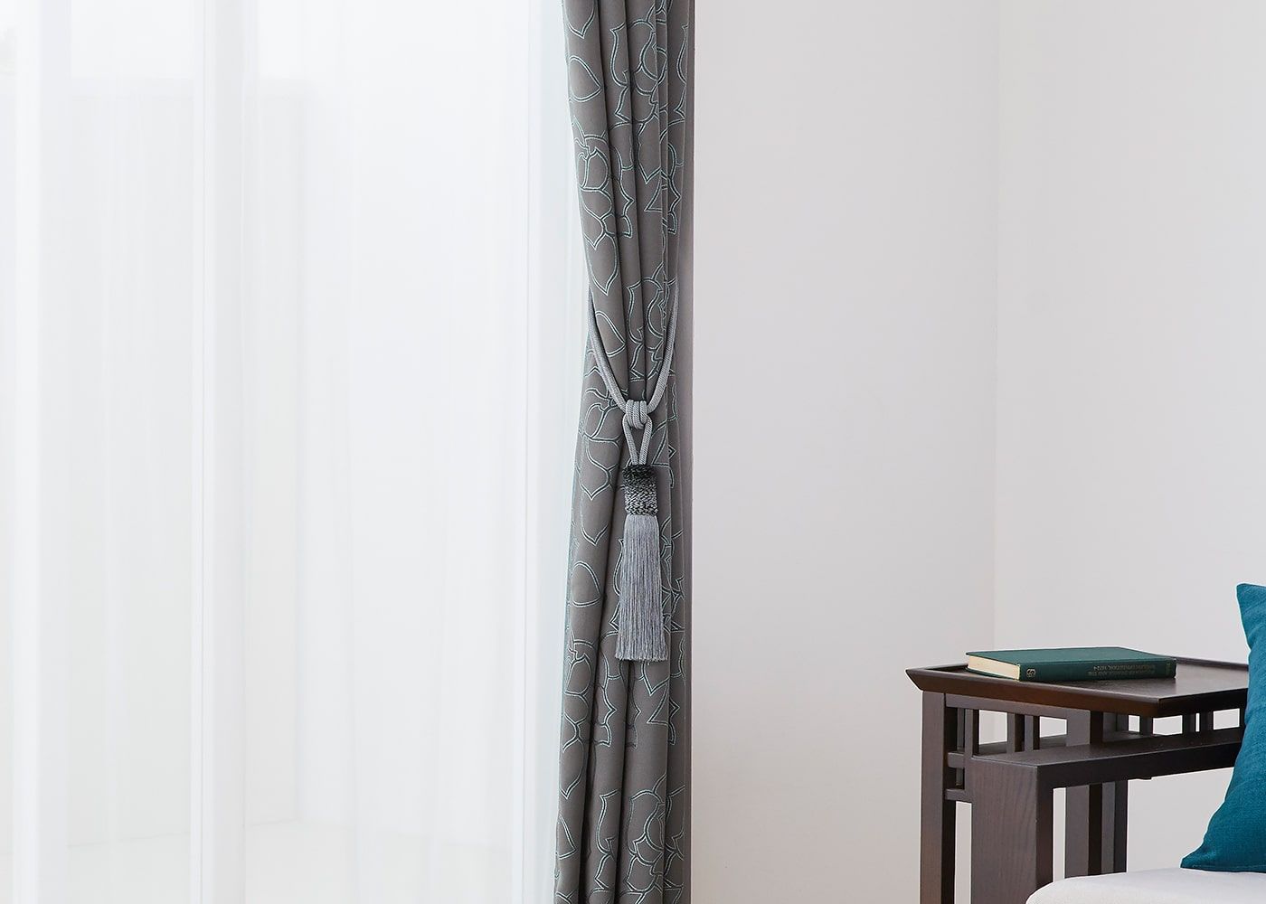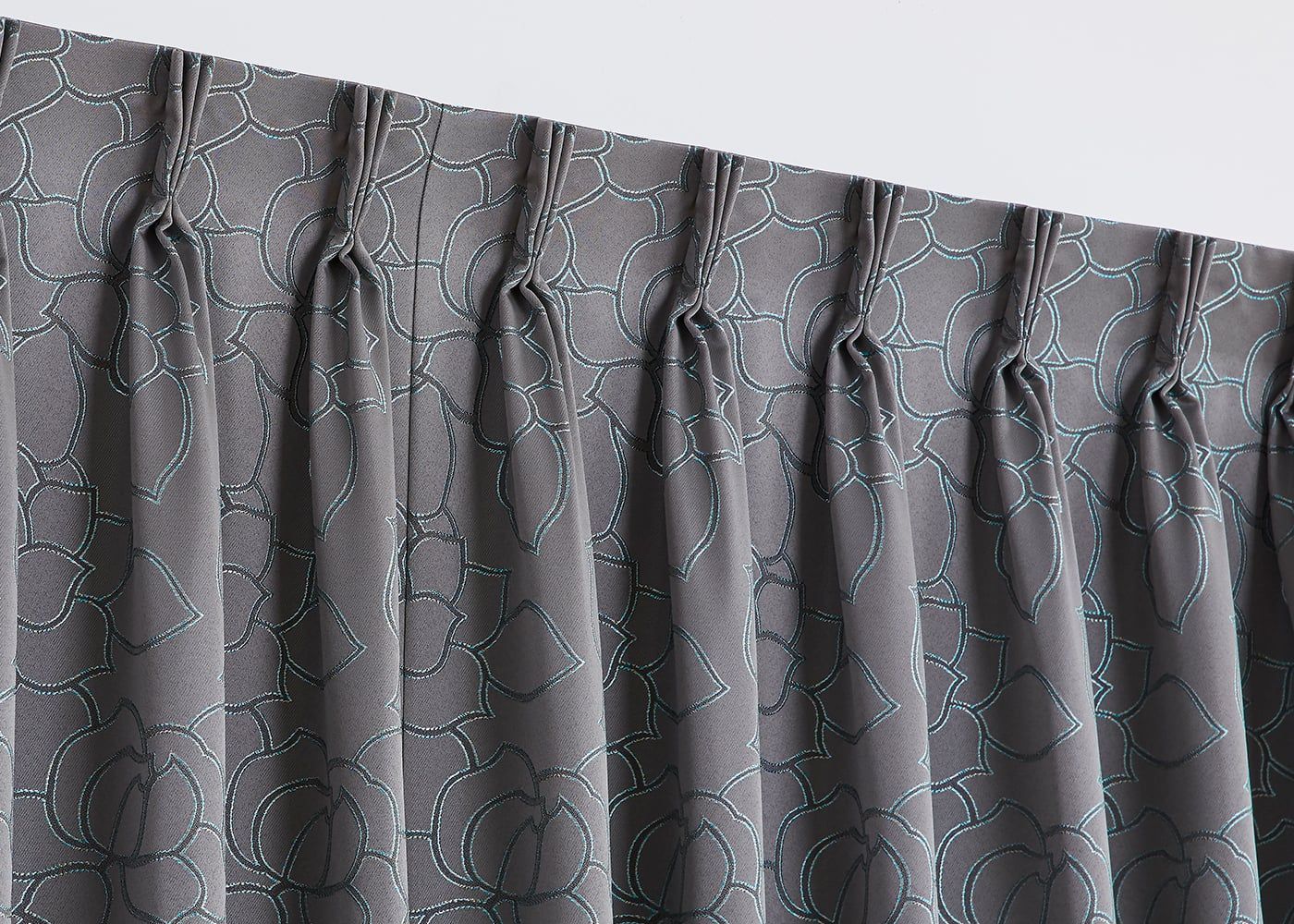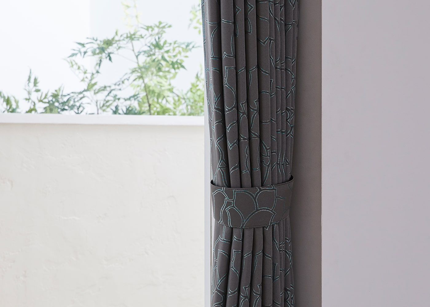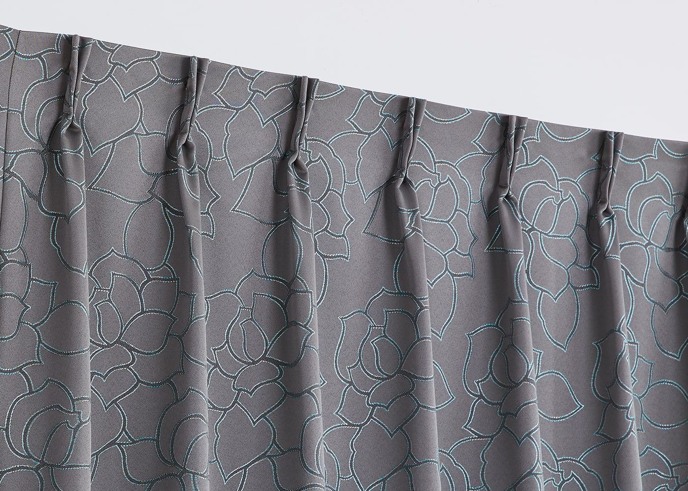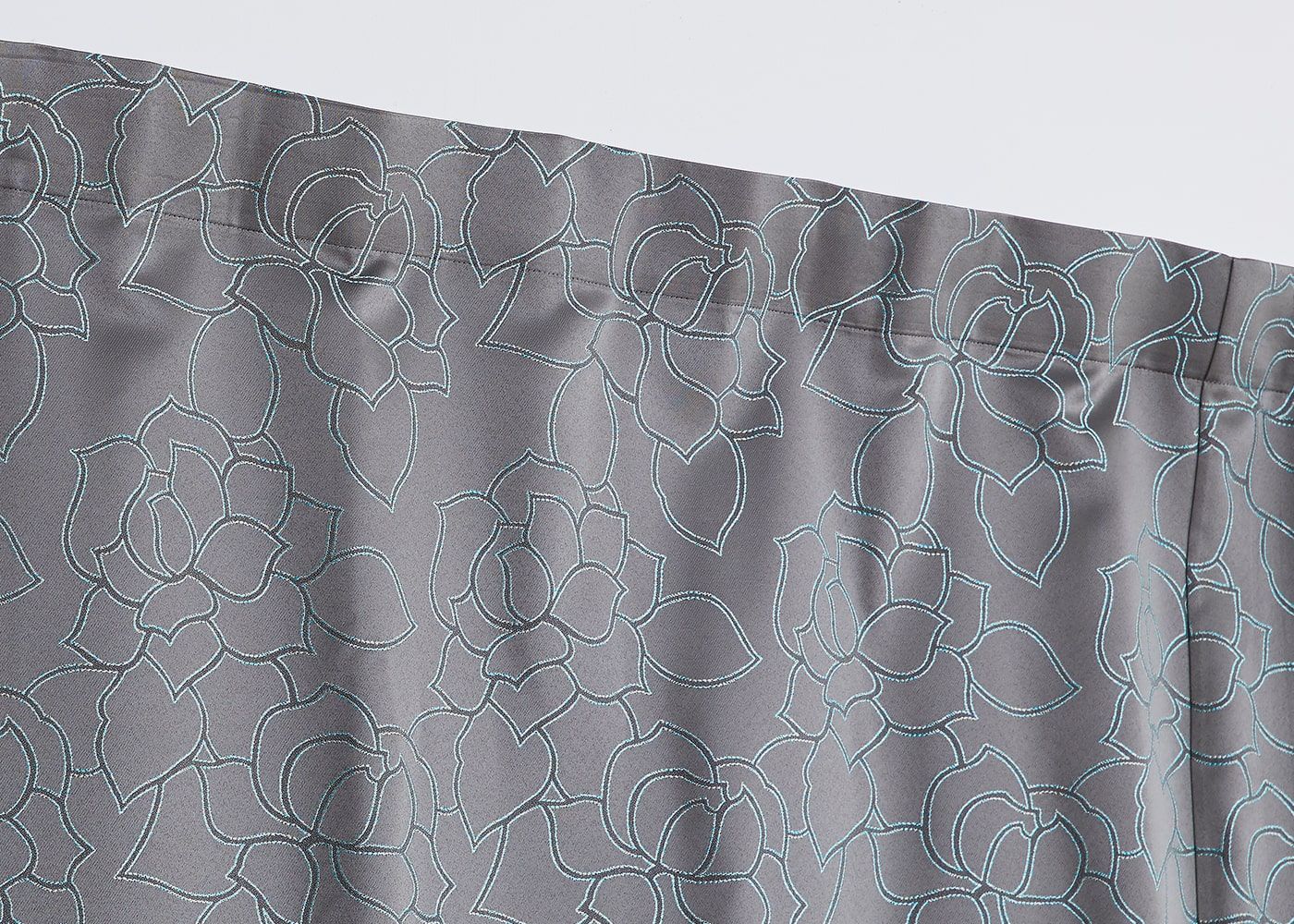 タッセルで束ねた時も、バラの花のラインがアクセントになって、空間を彩ります。(写真はグレー ノンタック)