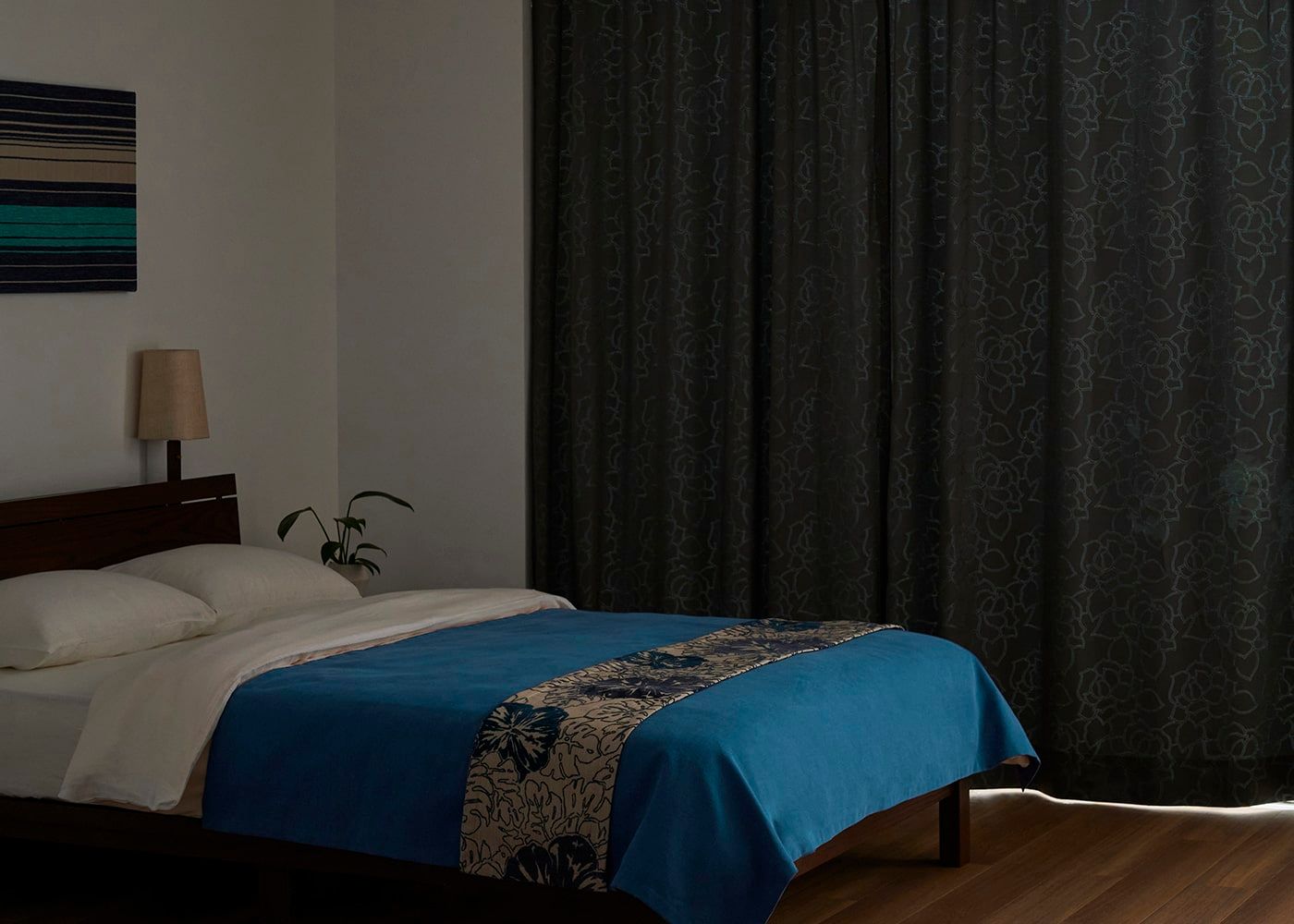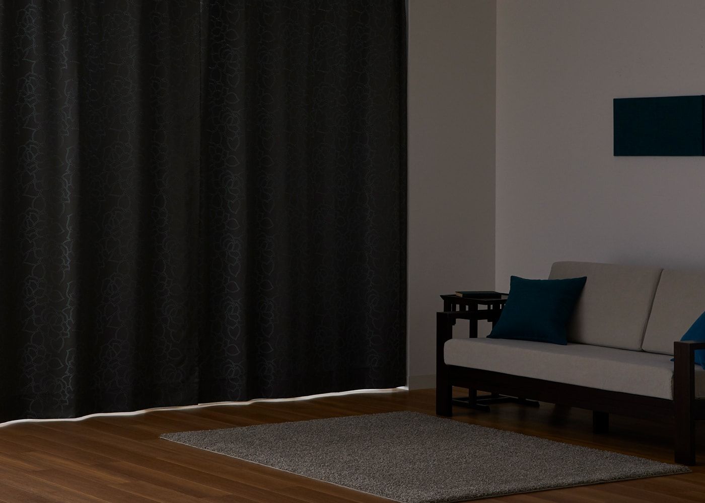 ルートは生地が厚いため、遮光カーテンのように室内への光を遮ってくれます。(写真はグレー ノンタック。室内照明OFF。)