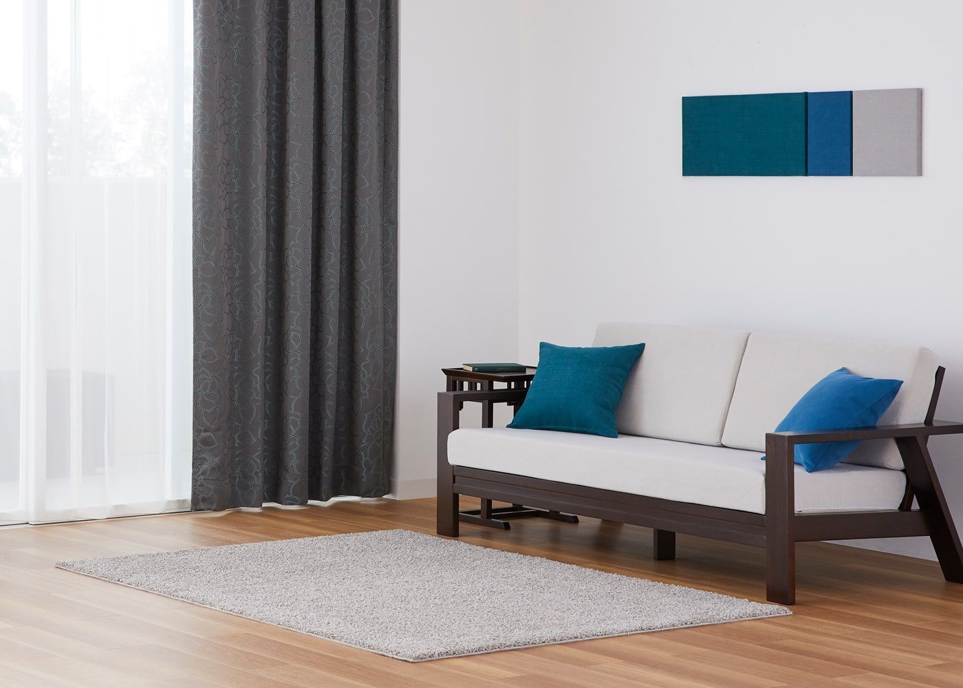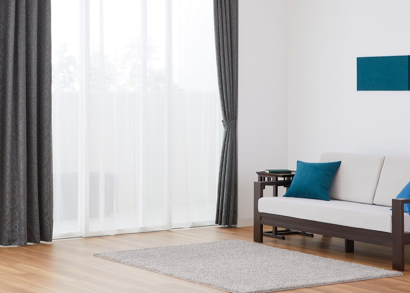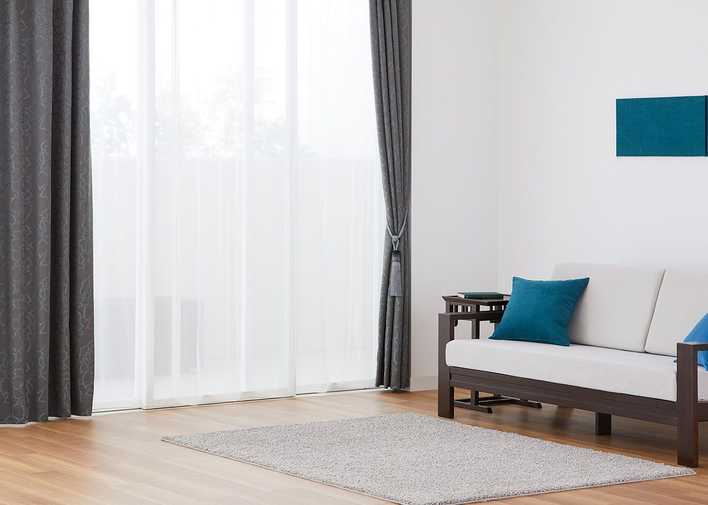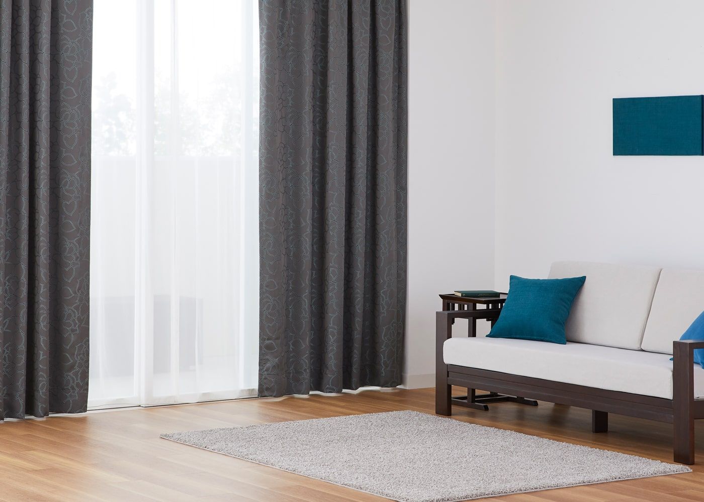 ノンタックは、レール巾に近い長さの生地を使用してヒダを作らない、どんな空間にも合わせやすいシンプルな雰囲気が魅力。使用生地が少ないため、一番リーズナブルにオーダーカーテンが作れます。ファブリックの表情や柄を活かしたコーディネートをしたい方やフラットな見た目にしたい方におすすめです。(写真はグレー ノンタック)