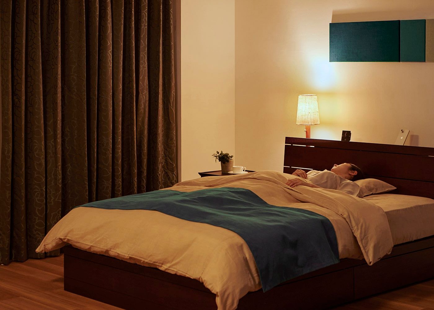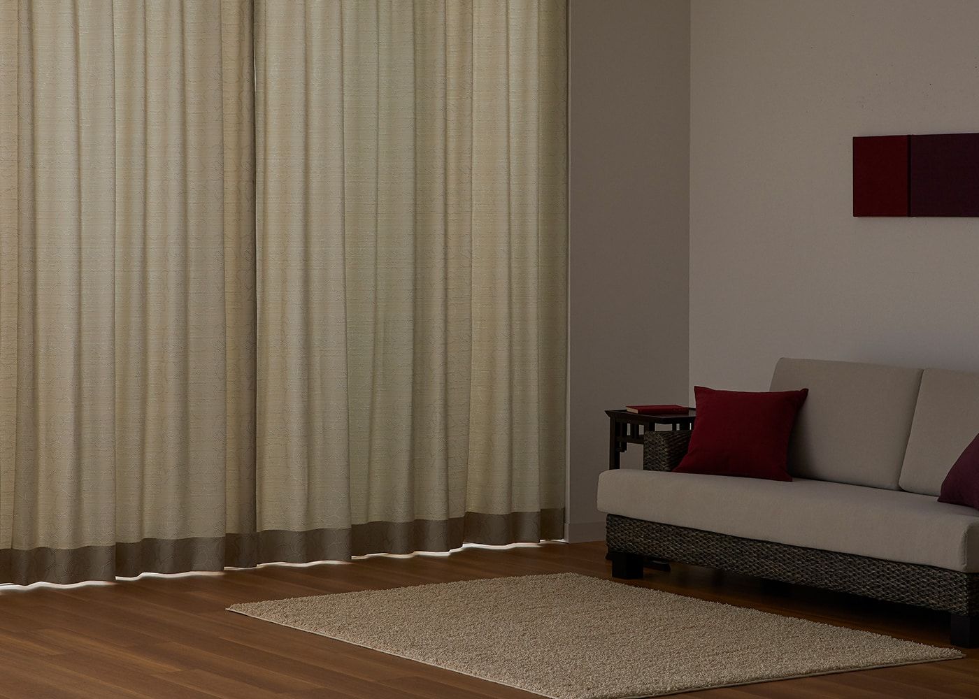 ここからは、カーテンの色やスタイル別でカーテンを閉じた際のイメージが比較できます。写真はグレー ノンタック。室内照明ON。