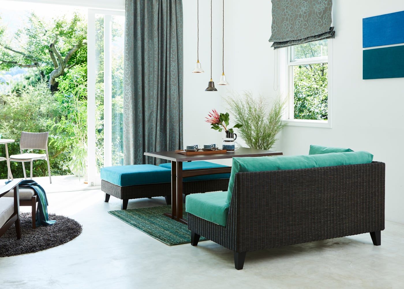 ソファカバーで表現することで、自然の佇まいを感じるリゾート空間に。≫軽井沢の自然から生まれたグリーンのインテリアコーディネートは