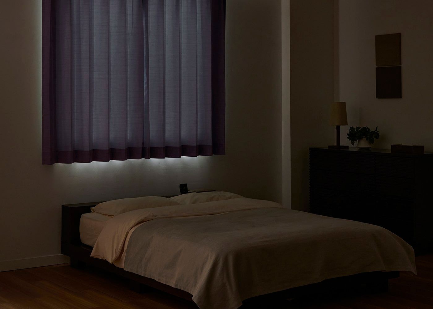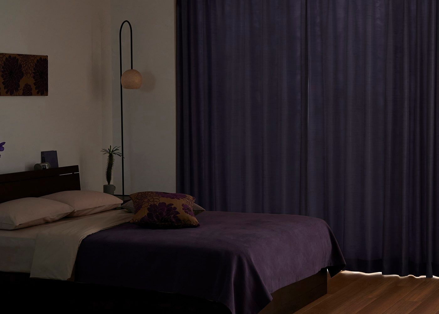 太陽の光に邪魔されず朝までしっかりと眠りたい方は、遮光カーテンがおすすめです。(写真はパープル プリーツ1.5倍ヒダ。室内照明OFF。)