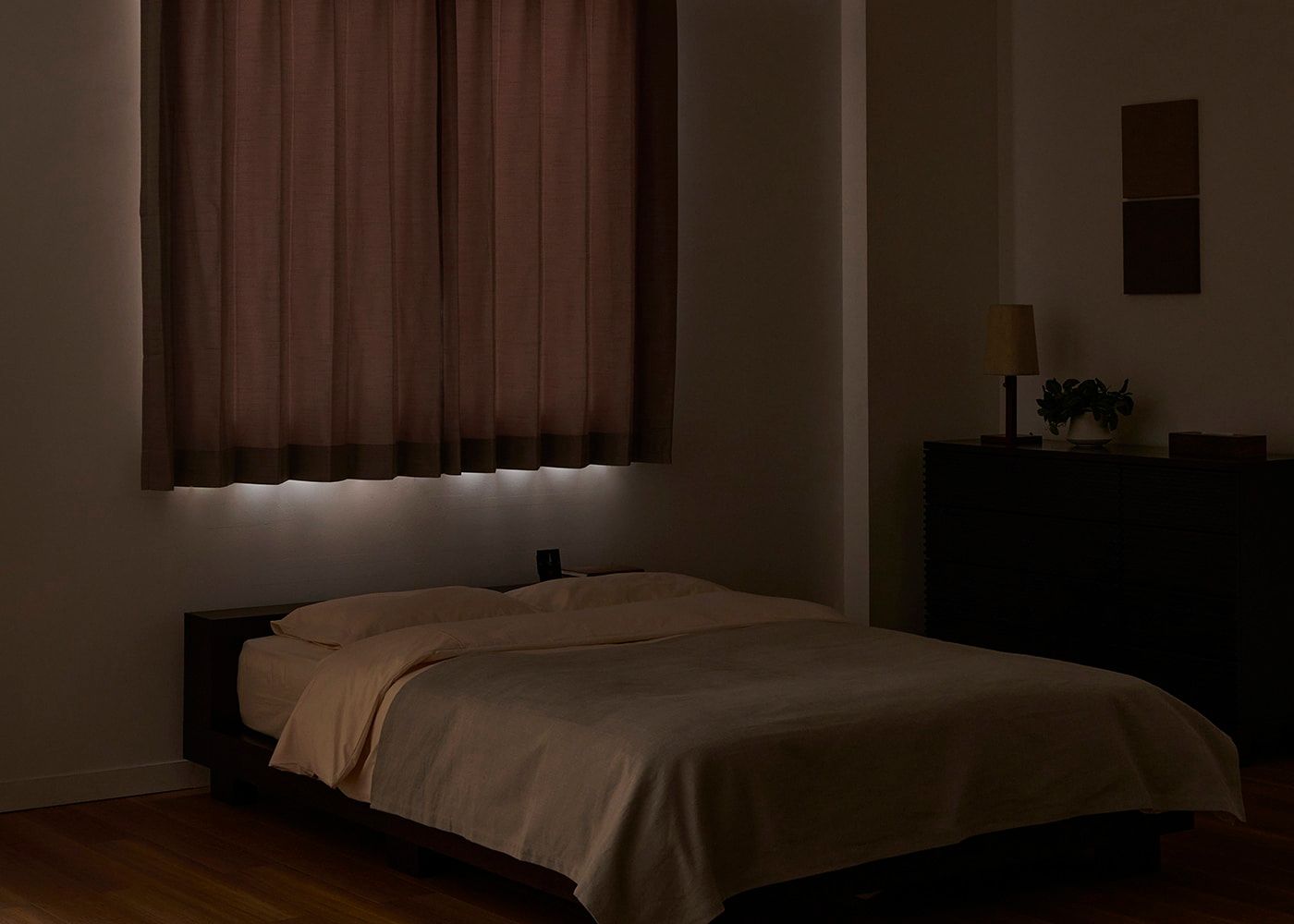 寝室の腰窓にジュールを合わせて洗練感のあるベッドルームを演出。(写真はブラウン プリーツ1.5倍ヒダ。