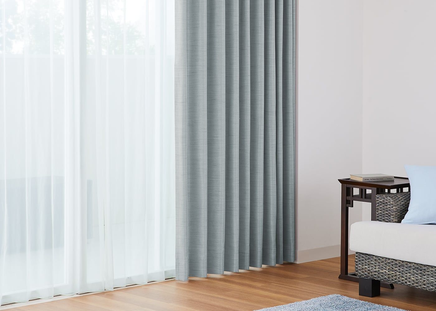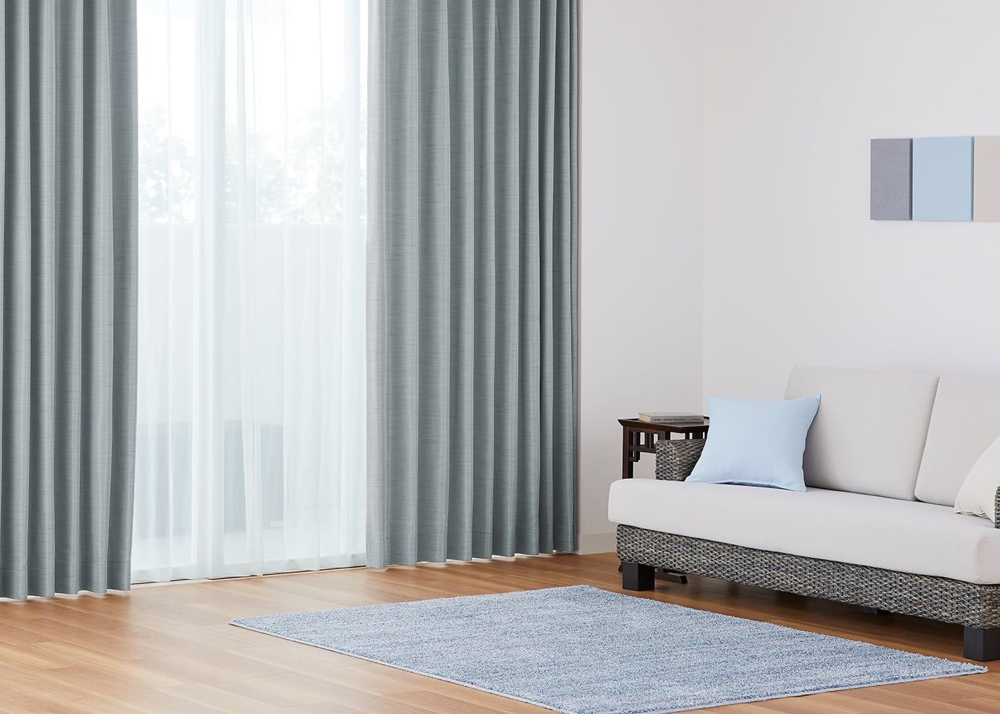 ファブリックパネルでグレージュ系でまとめると、爽やかなブルー×グレーコーディネートの完成です。(写真はライトブルー プリーツ1.5倍ヒダ)