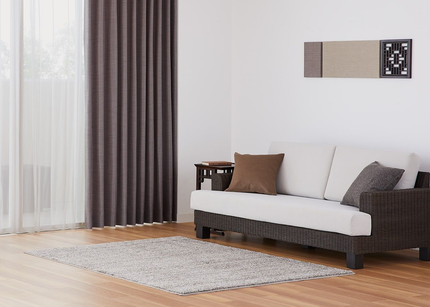 ノンタックはヒダを作らず、生地の表情や柄を活かせるシンプルなカーテン。どんな空間にもなじみやすく、使用生地が少ないため手頃な価格で注文可能です。(写真はブラウン ノンタック)