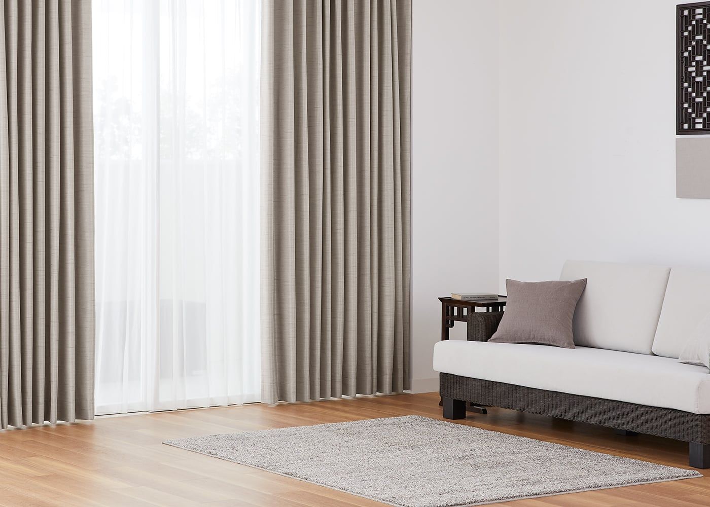 ベージュのカーテンはどんなコーディネートにも合わせやすく、空間を明るくやさしいイメージに。プリーツ2倍ヒダでエレガントさを演出できます。(写真はベージュ プリーツ2倍ヒダ)
