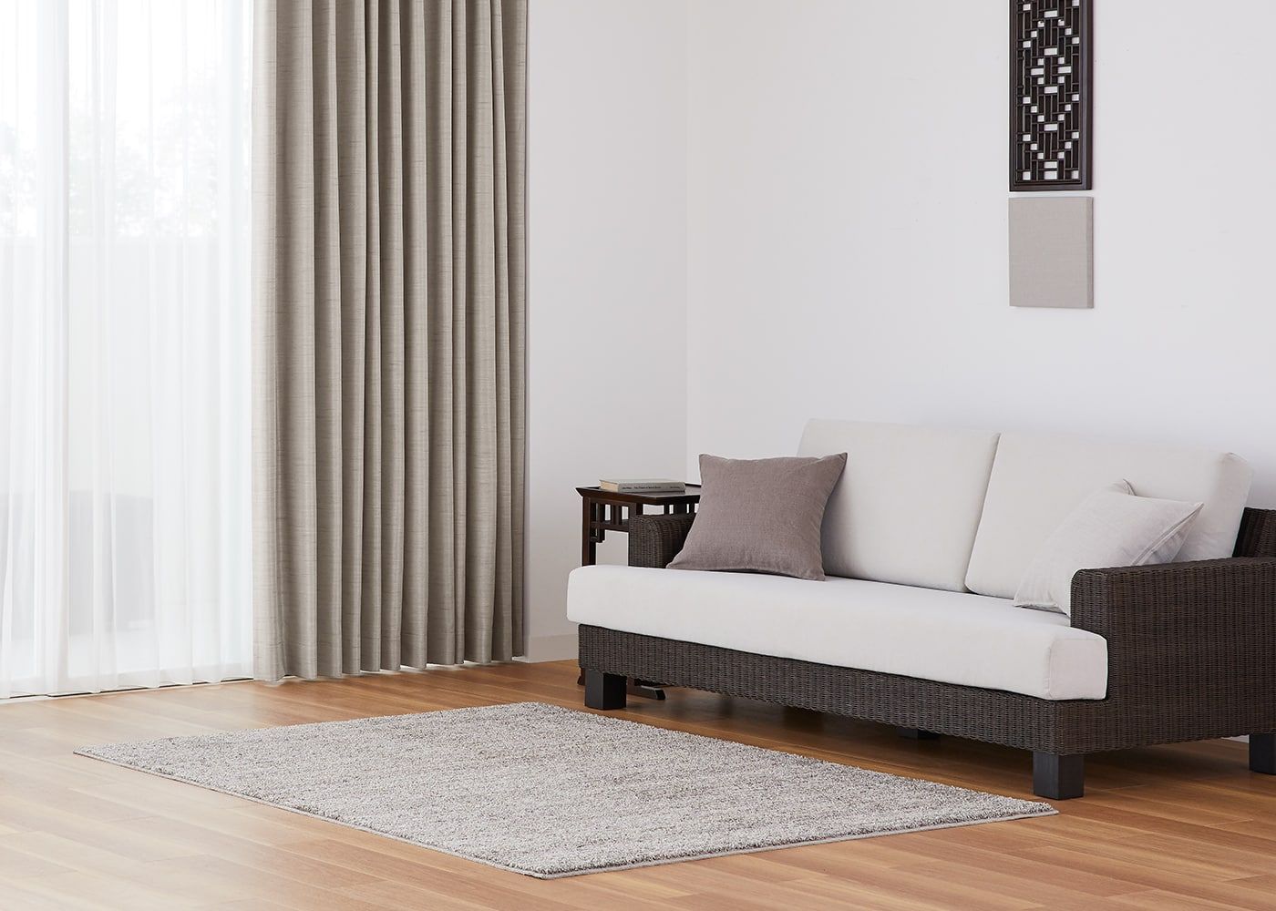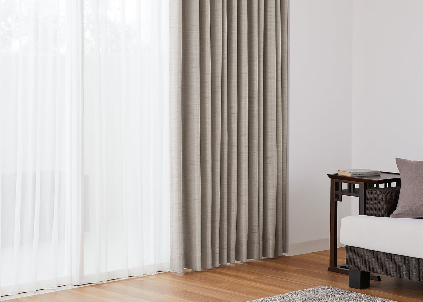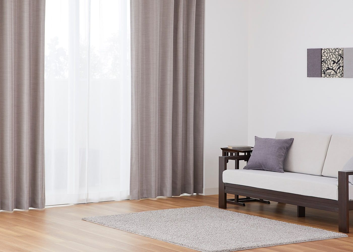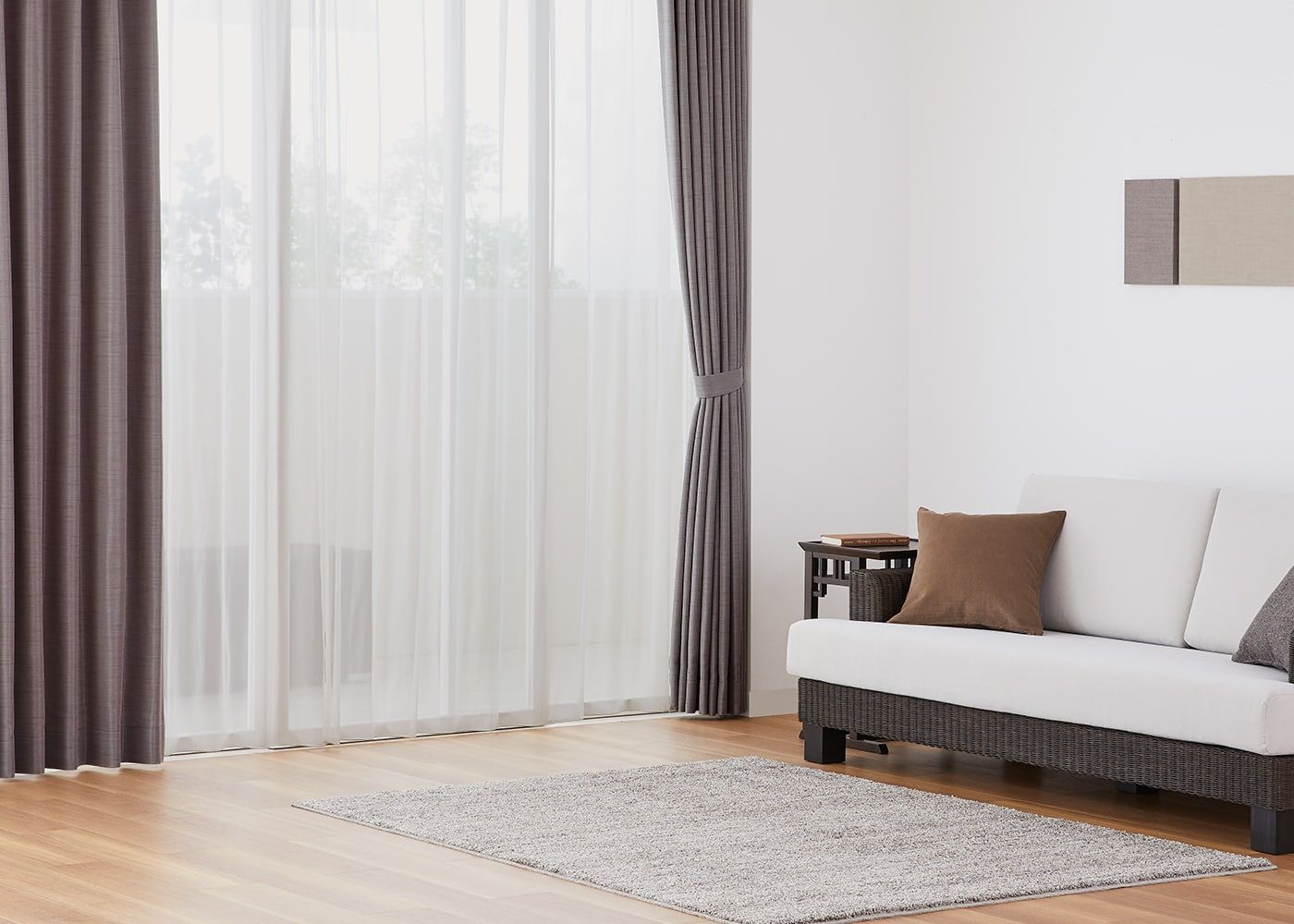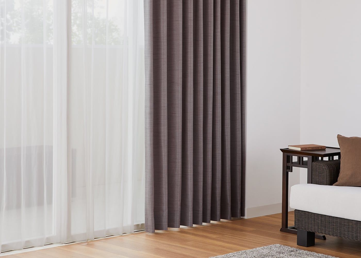艶やかな質感のジュールに、美しい光沢が魅力のブラウンのレースカーテンを組み合わせることで、より上品な雰囲気に仕上がります。(写真はブラウン プリーツ1.5倍ヒダ。