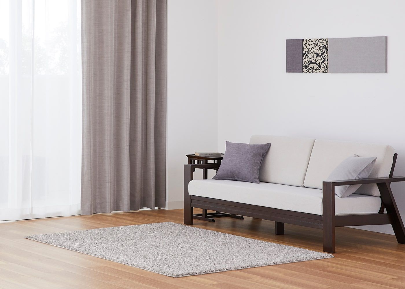 カーテンをヒダのないノンタックに仕上げると、お部屋がシンプルな雰囲気に。ファブリックの表情が楽しめるグレーをセレクトしました。(写真はグレー ノンタック)