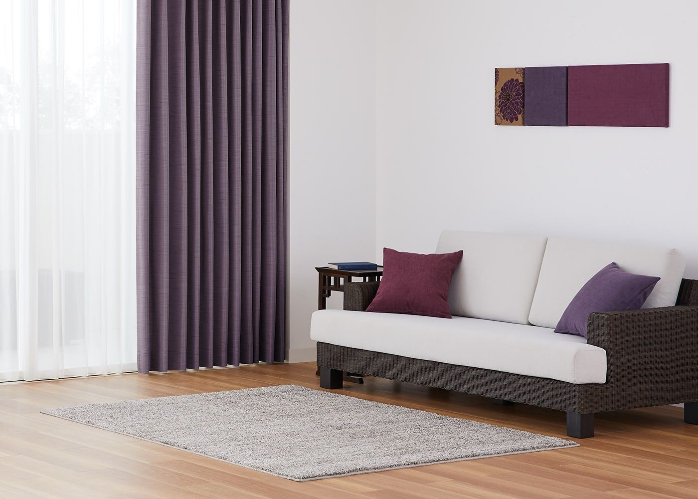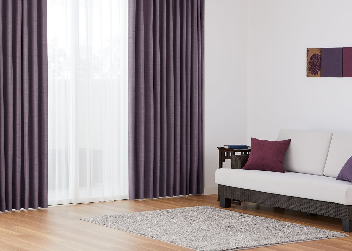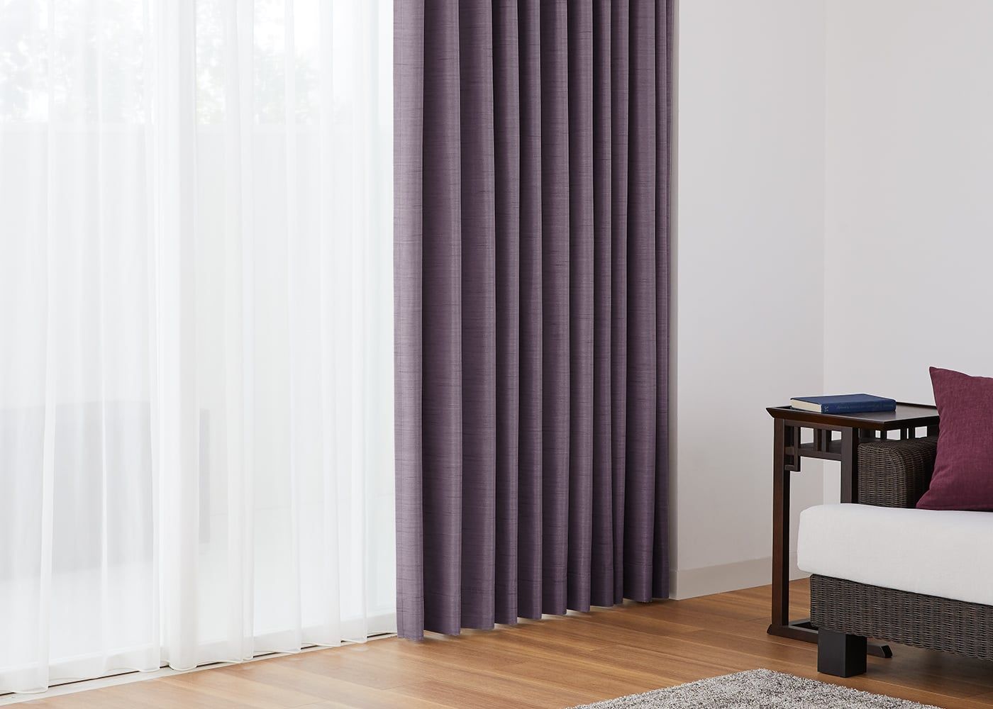 気品漂うパープルをセレクトすると、空間がぐっと華やかなイメージになります。プリーツ2倍ヒダでボリューム感を持たせ、エレガントさも演出できます。(写真はパープル プリーツ2倍ヒダ)