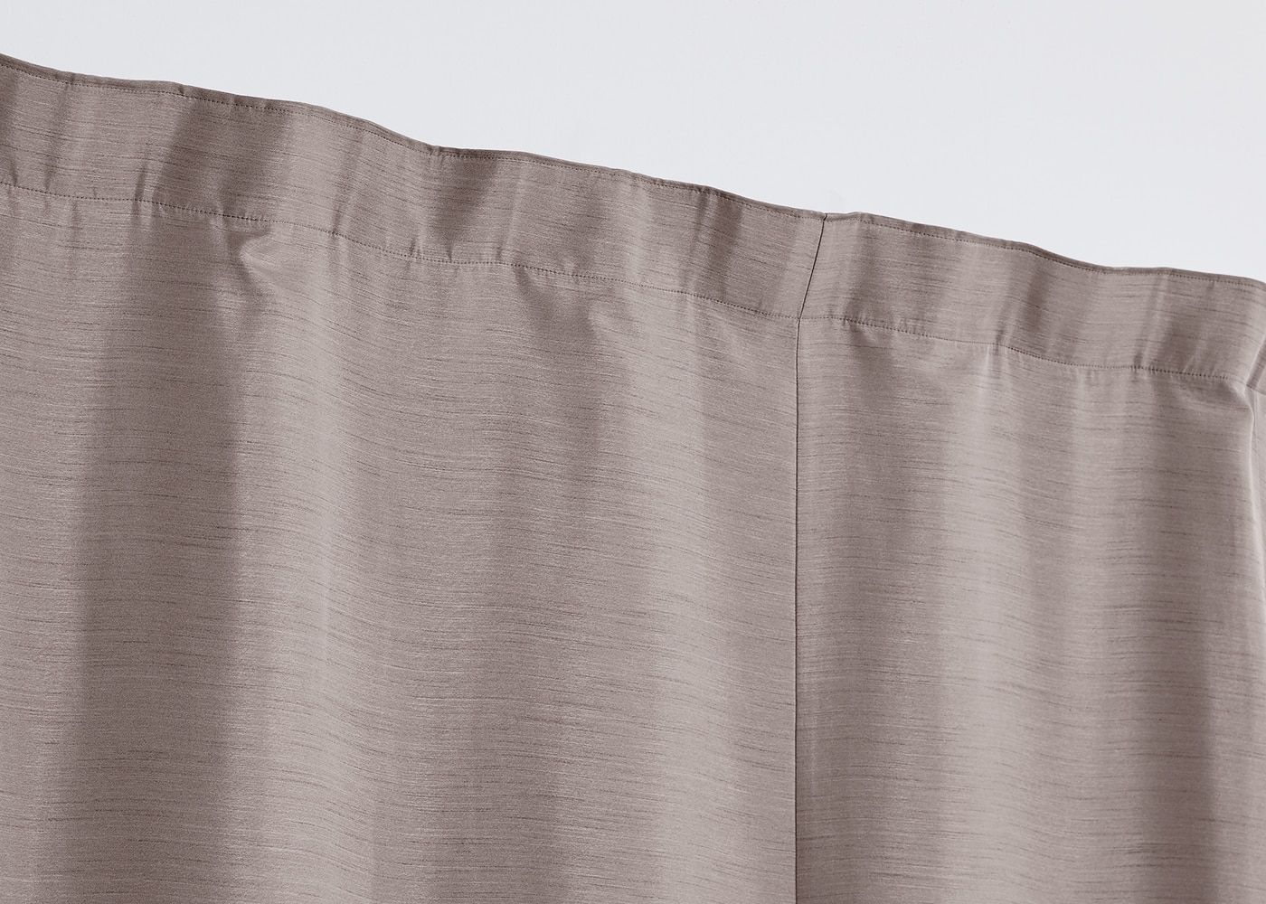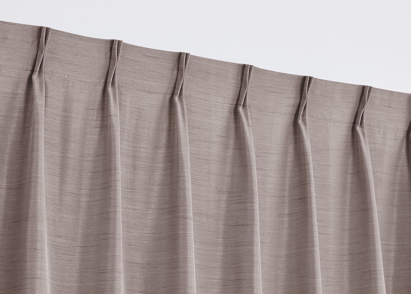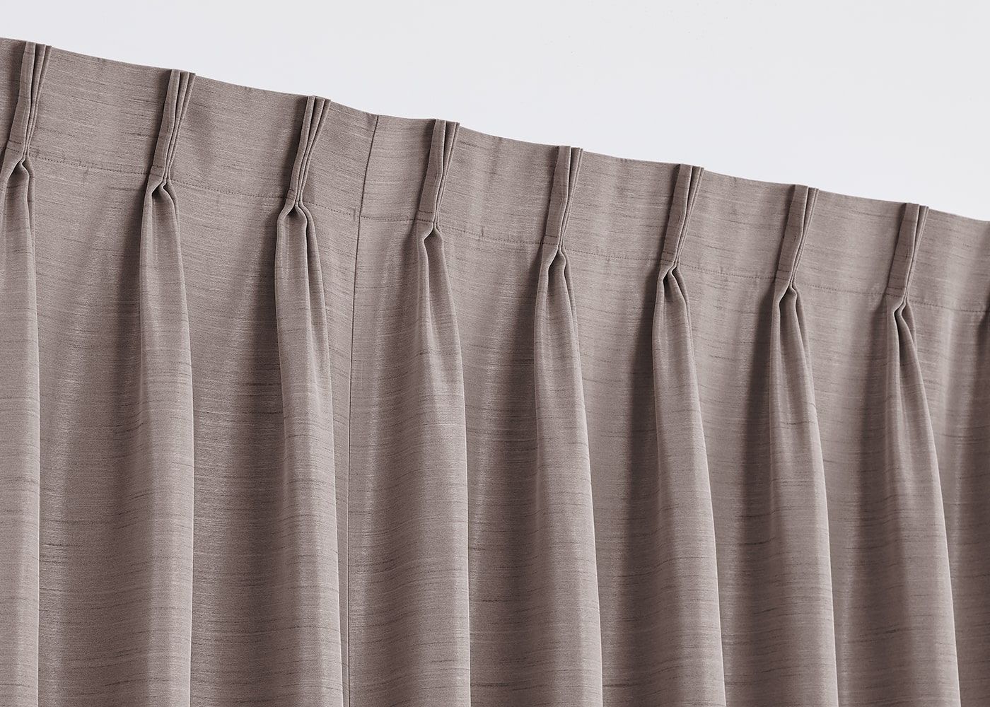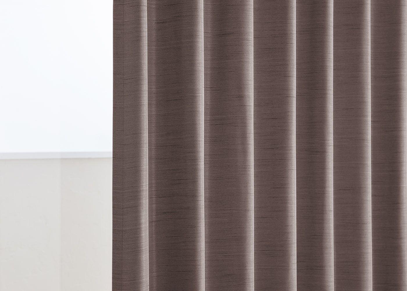 カーテンはプリーツ2倍ヒダ、1.5倍ヒダ、ノンタックの3種類。プリーツ2倍ヒダは、生地を贅沢に使いボリューム感と高級感を演出。ヒダによる空気の層で保温・断熱効果も期待できます。(写真はブラウン プリーツ2倍ヒダ)