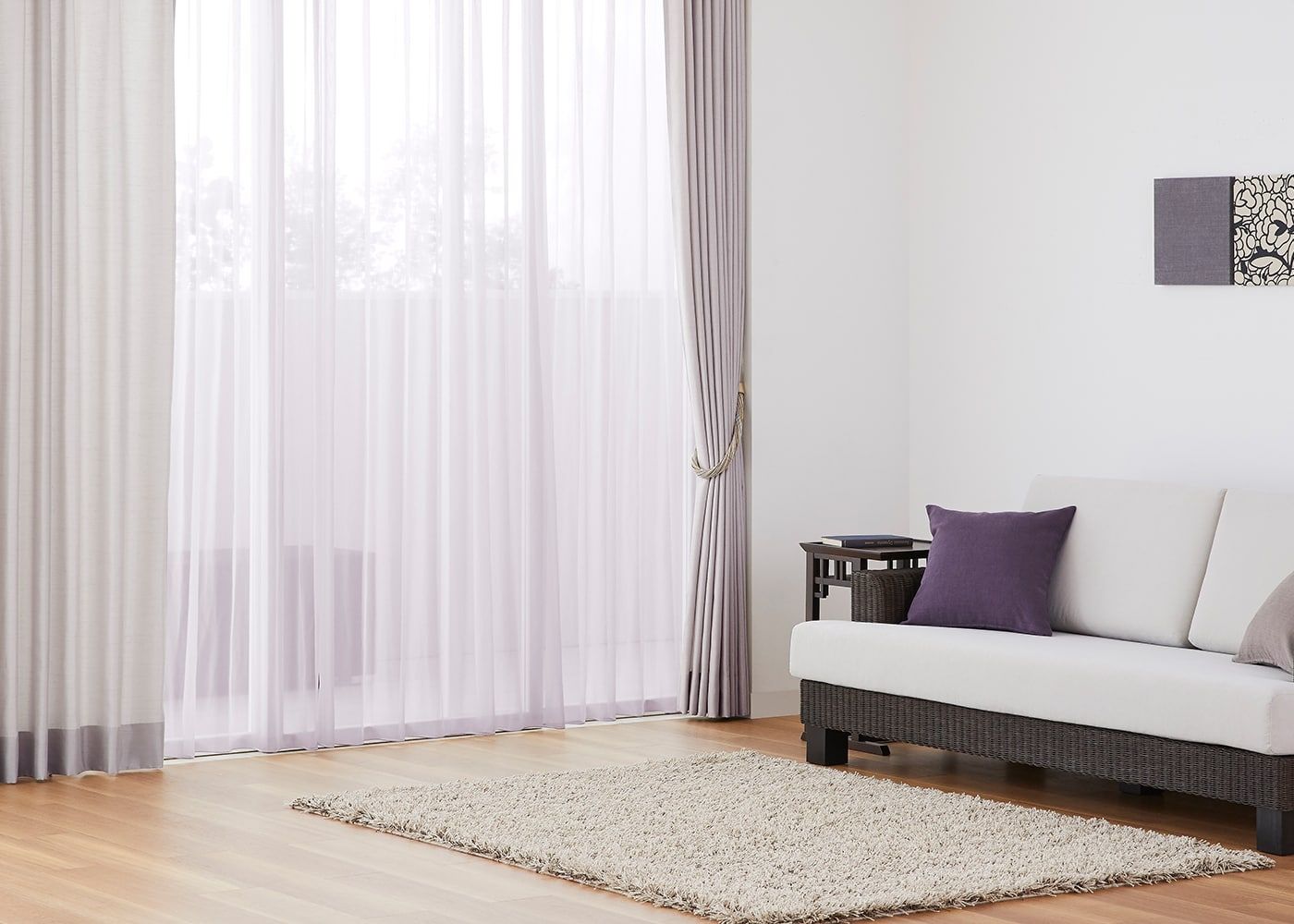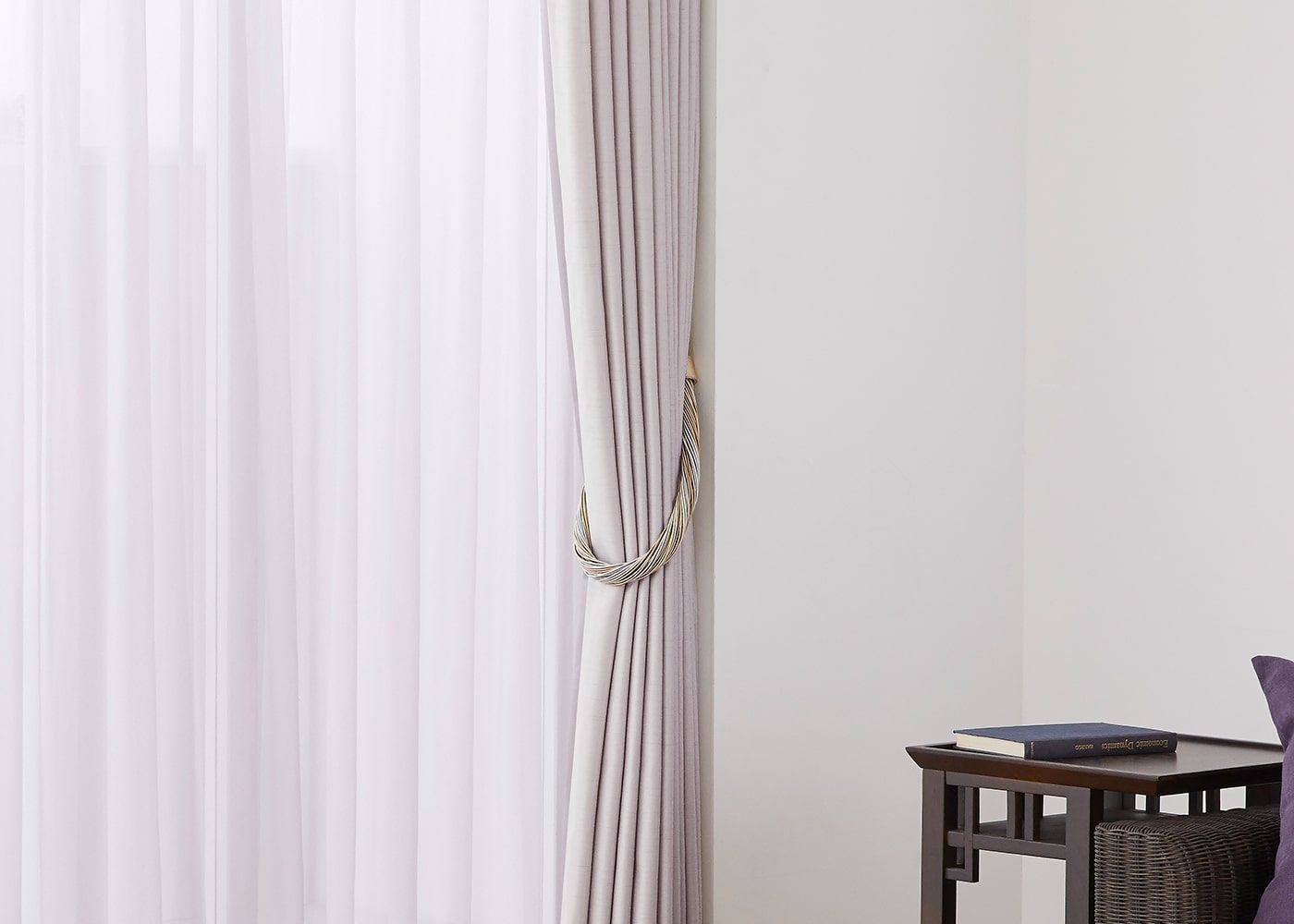 カーテンの雰囲気に合わせた装飾タッセルを取り入れて、ワンランク上のインテリアを楽しんでみては。(写真はシルキーv02のライトパープルと
