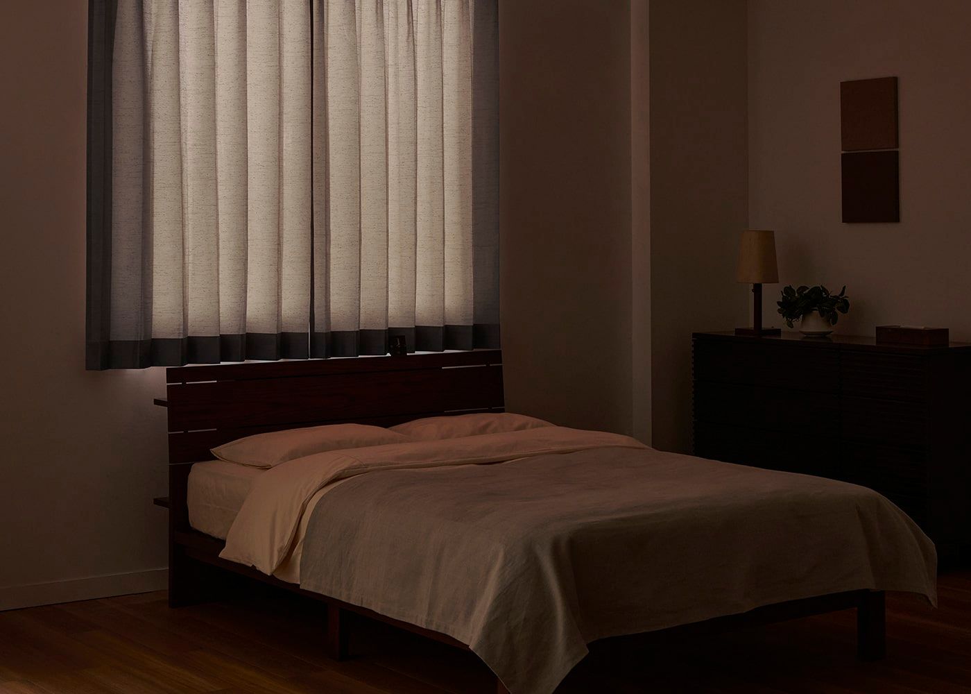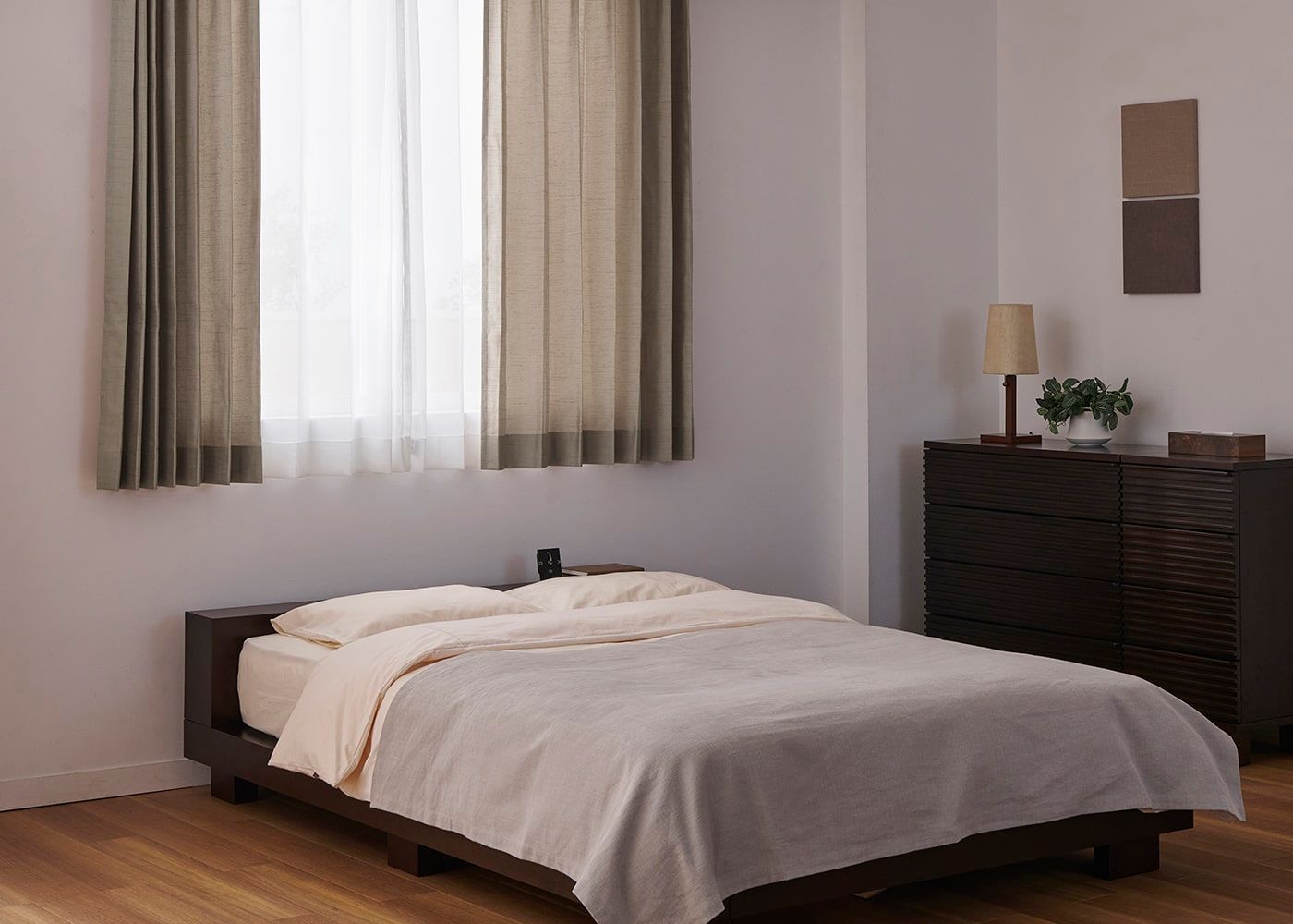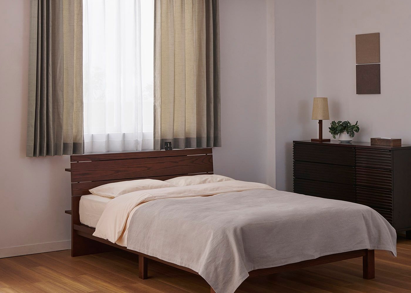腰窓のカーテンと高さのあるベッドを組み合わせる時は、ヘッドボードにかからないようにカーテン丈の採寸にご注意ください。
