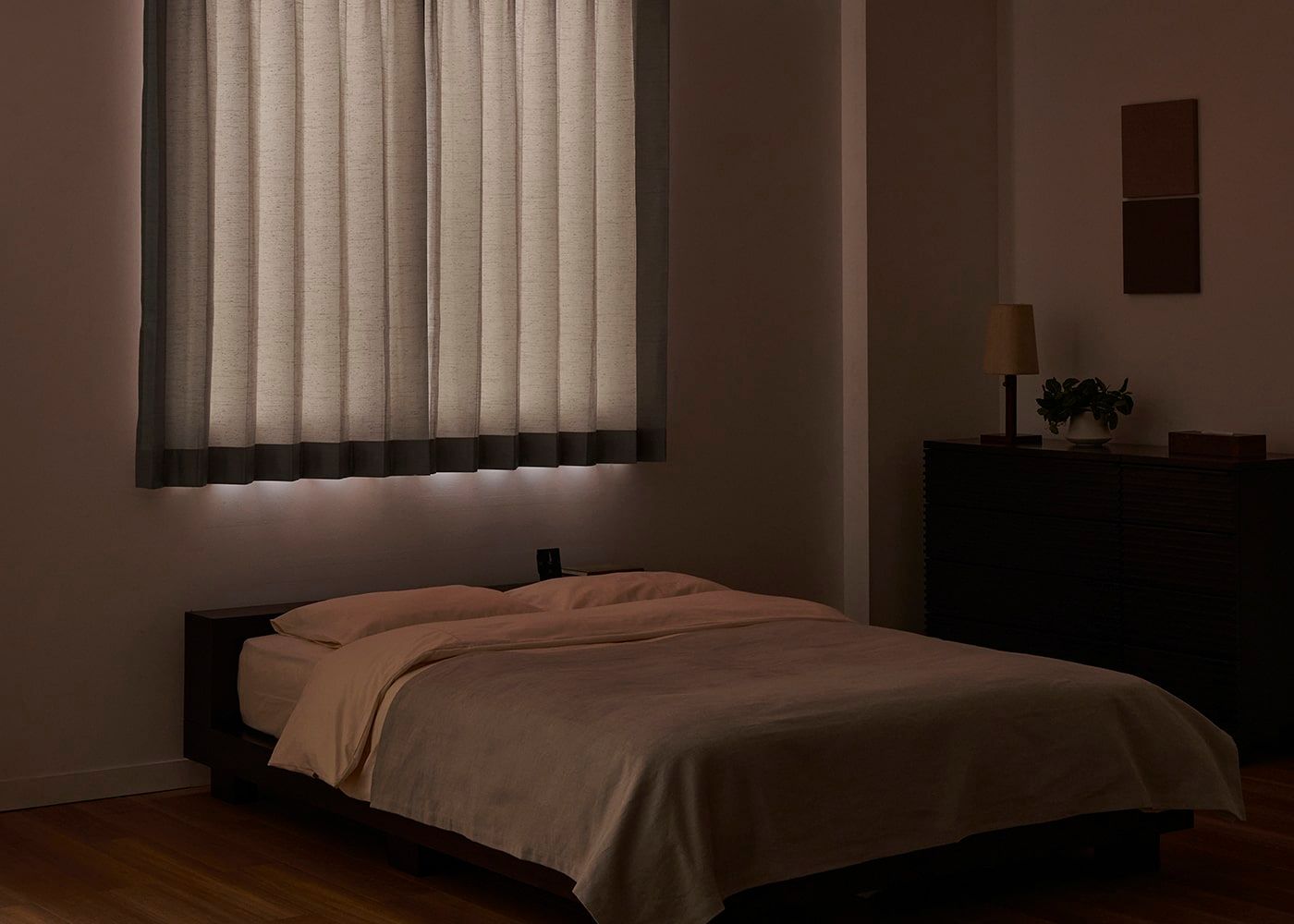 参考までに、カーテンを閉じた際のイメージです。光の入り方や色合いの変化をご確認ください。(写真はライトブラウン ノンタック。室内照明ON)