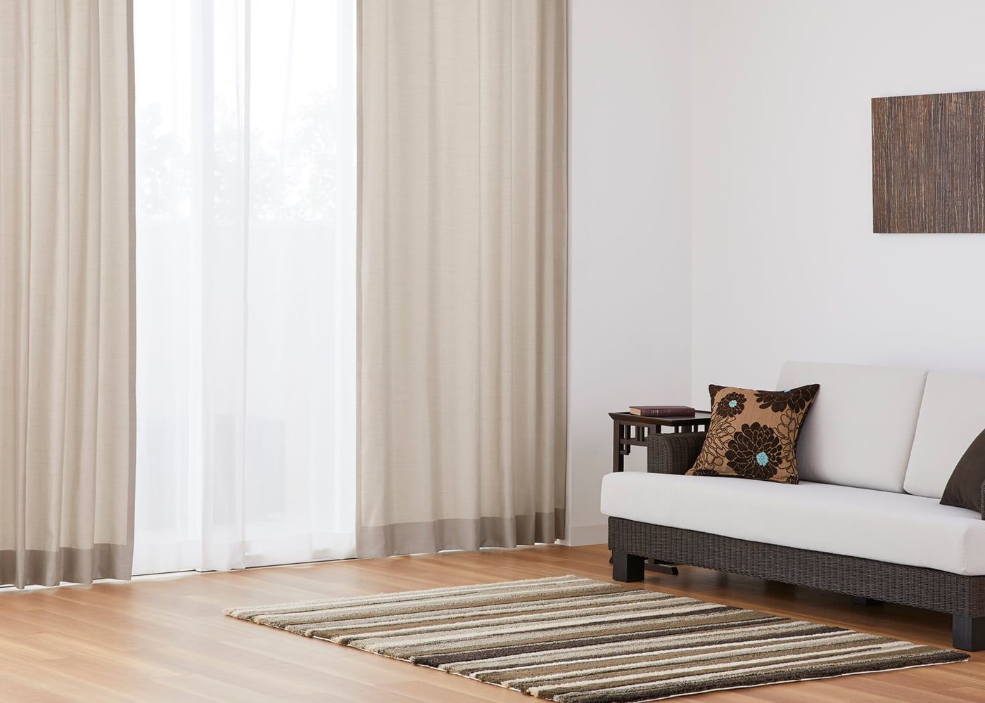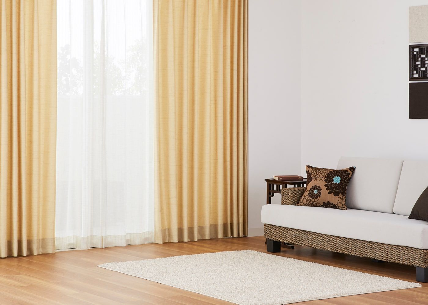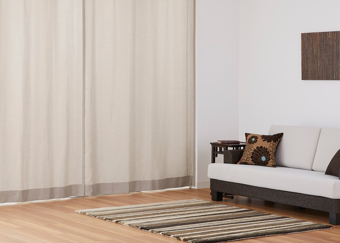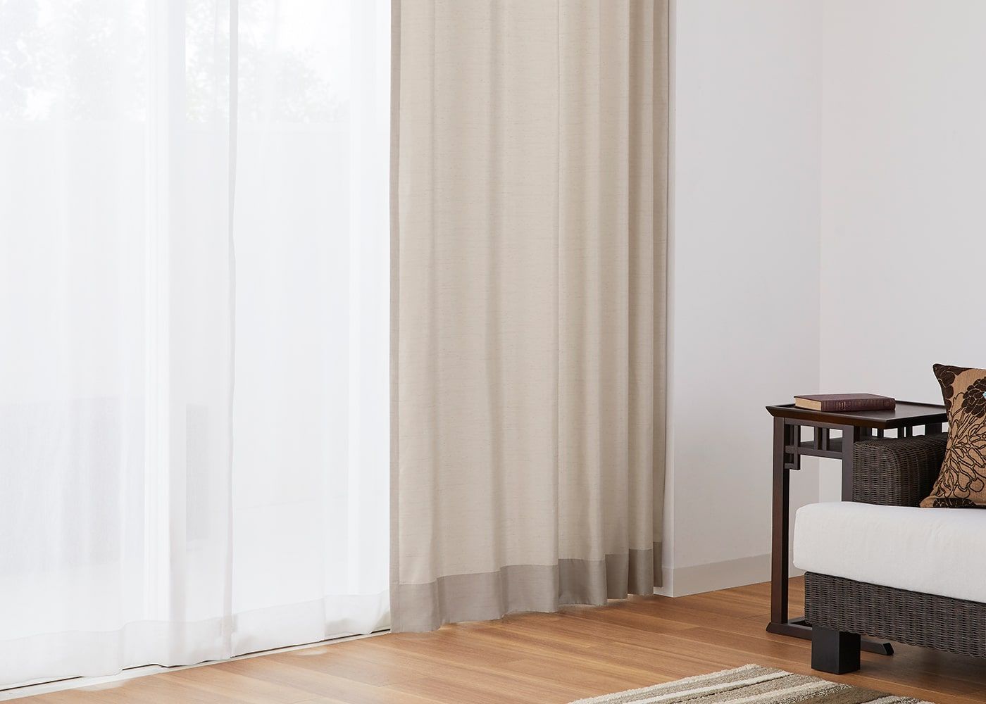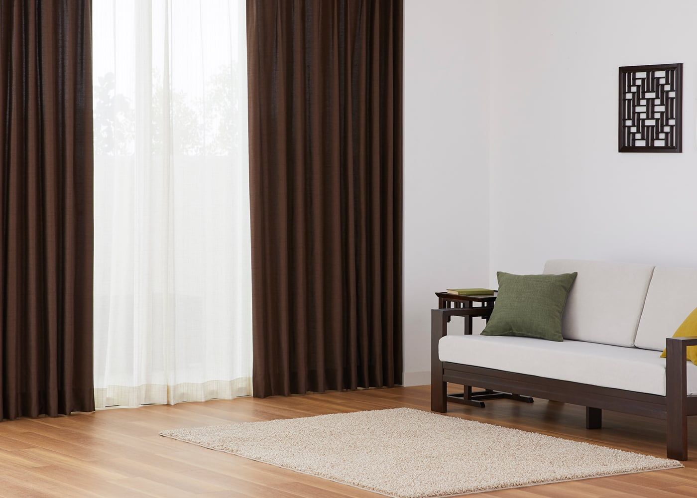 穏やかな色みのブラウンのドレープカーテンに、真っ白なレースカーテンを組み合わせると、より明るい雰囲気を演出してくれます。(写真はライトブラウン ノンタック。