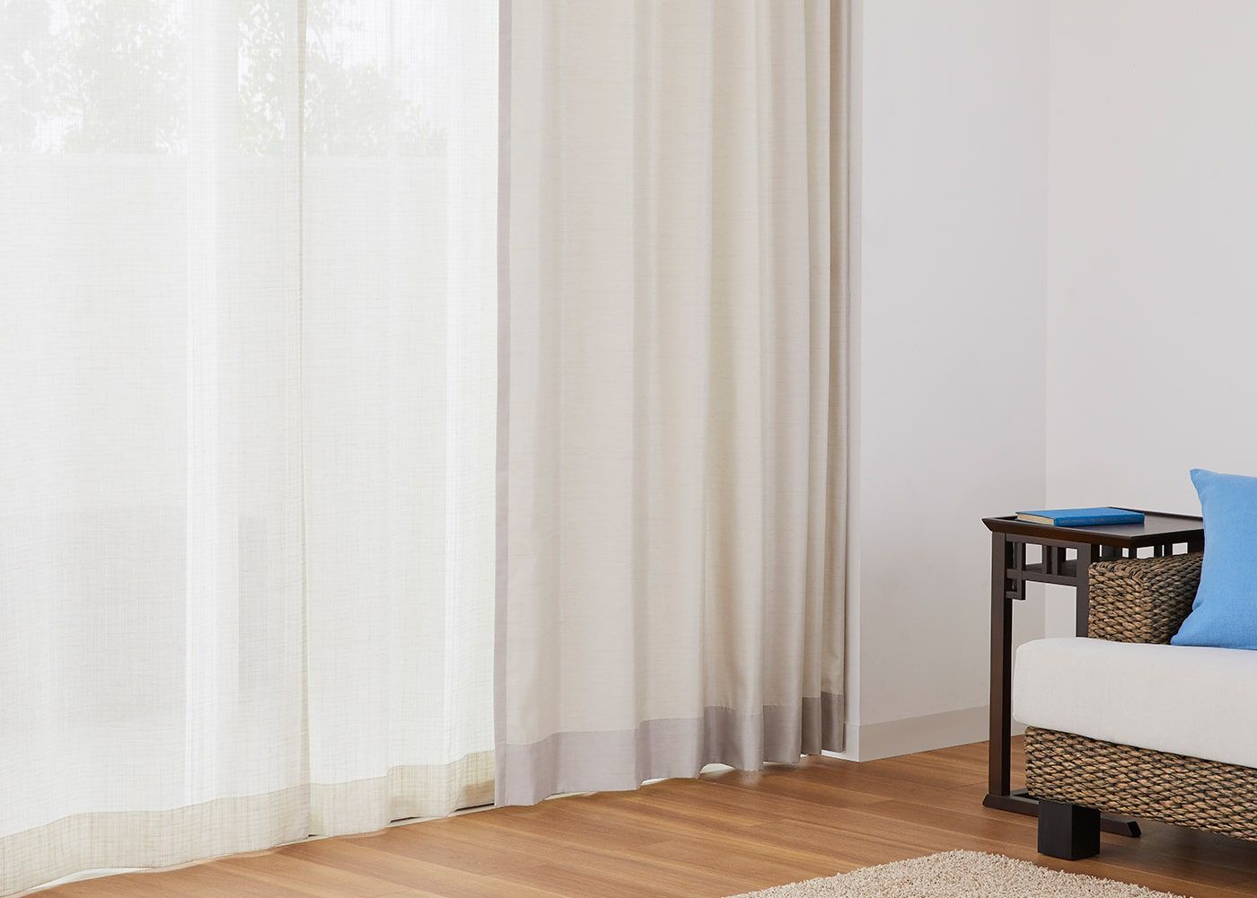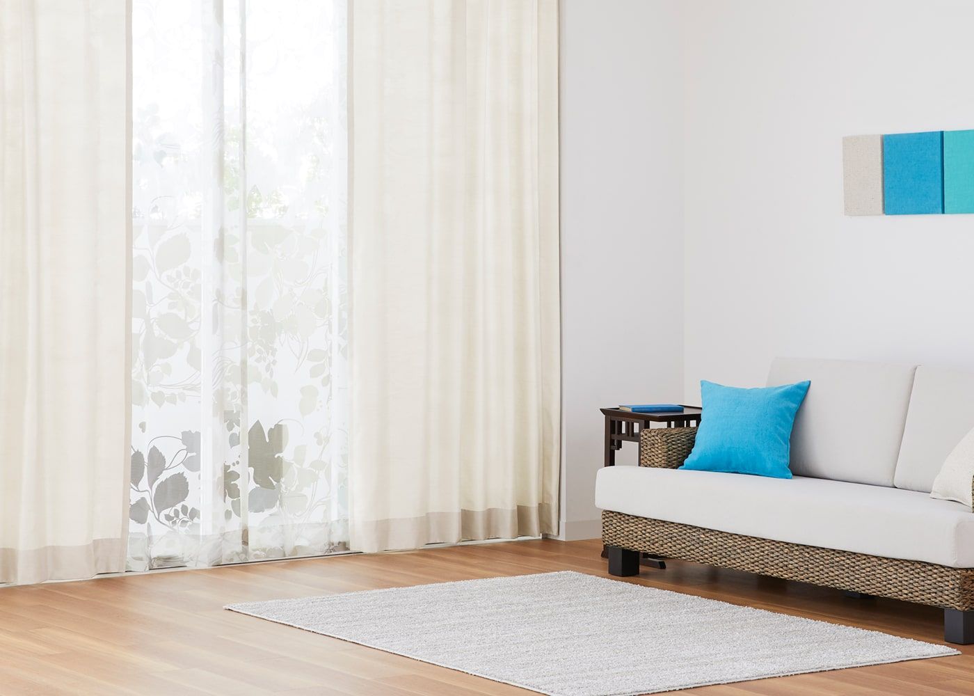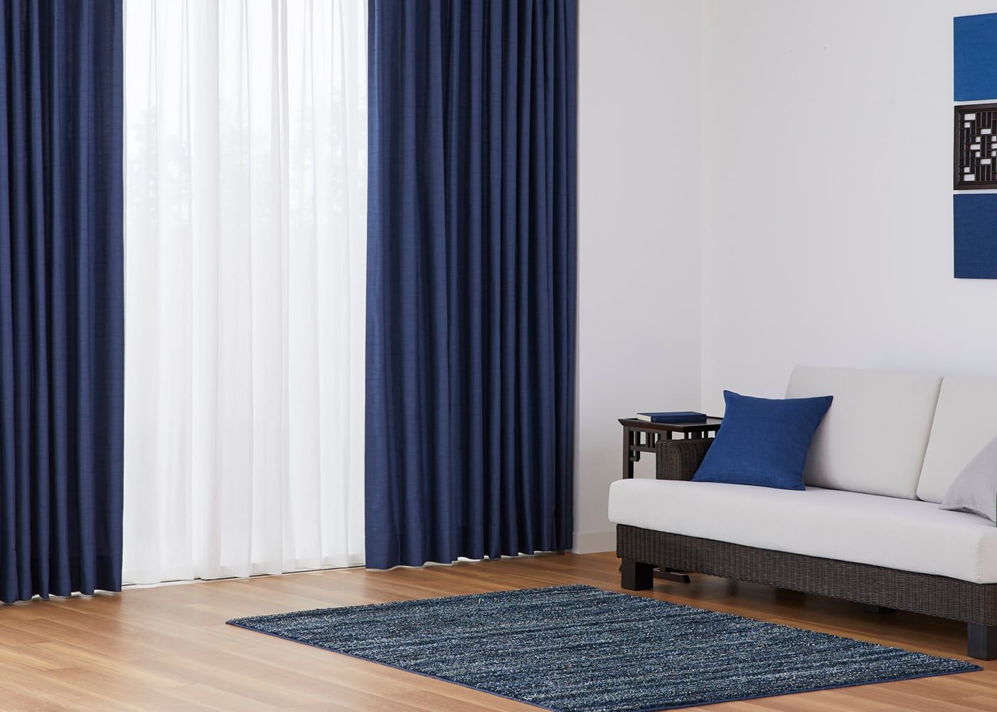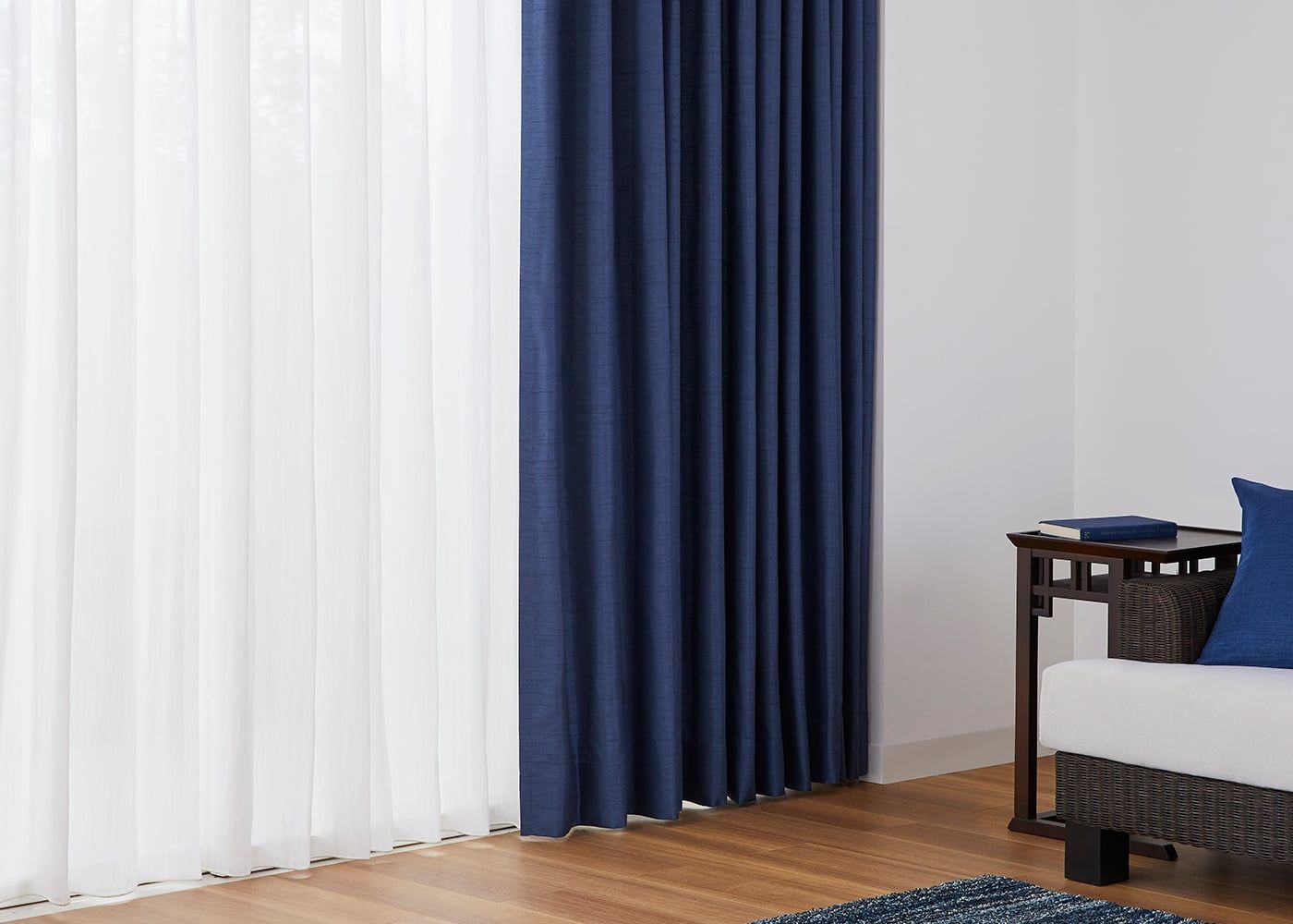 クールな印象のブルーのカーテンに麻のような素材感のレースカーテンを組み合わせると、色と素材のコントラストが楽しめます。(写真はブルー プリーツ2倍ヒダ。