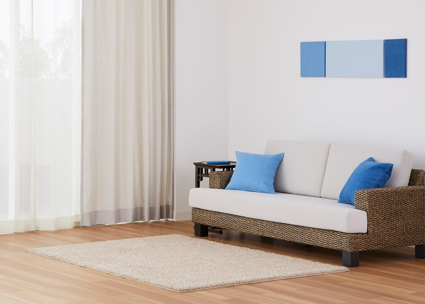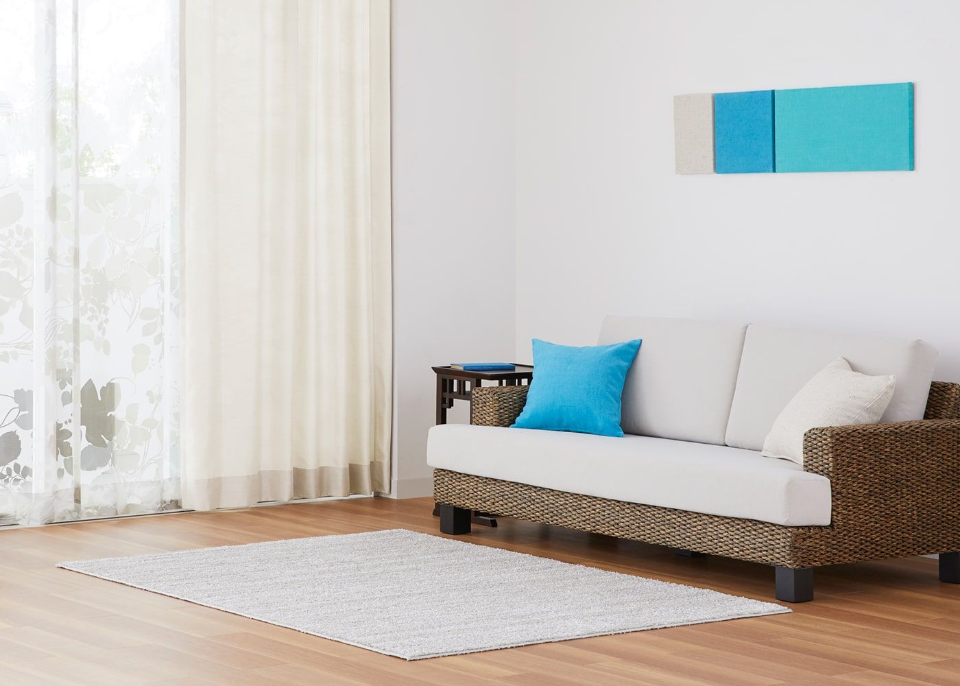 ラグを添えるだけで、白浜のビーチを思わせる爽やかなブルーコーディネートの完成です。(写真はアイボリー ノンタック)