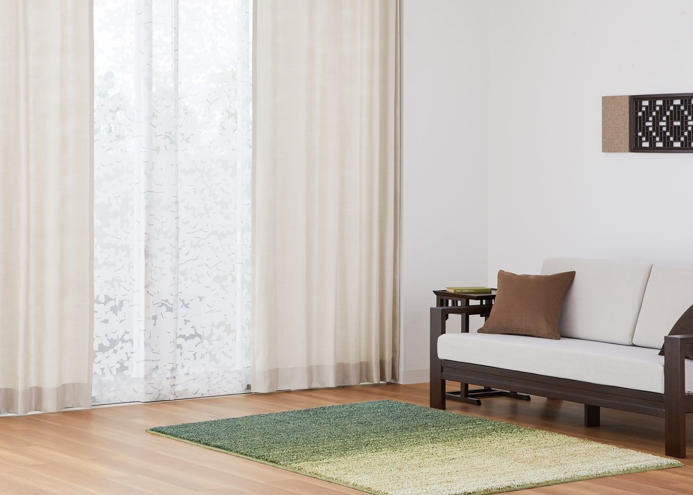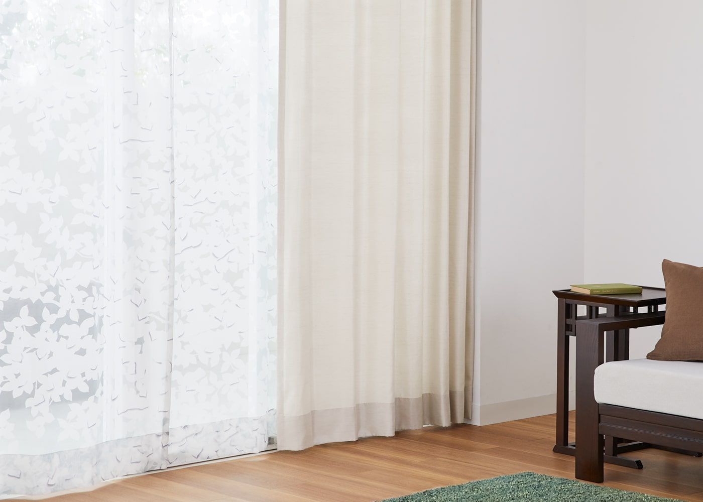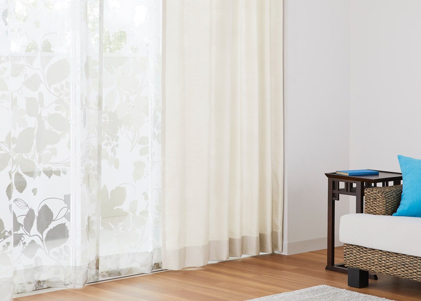 シンプルなドレープカーテンにリーフ柄のレースカーテンを組み合わせると、木陰にいるかのような雰囲気が楽しめます。(写真はナチュラル ノンタック。
