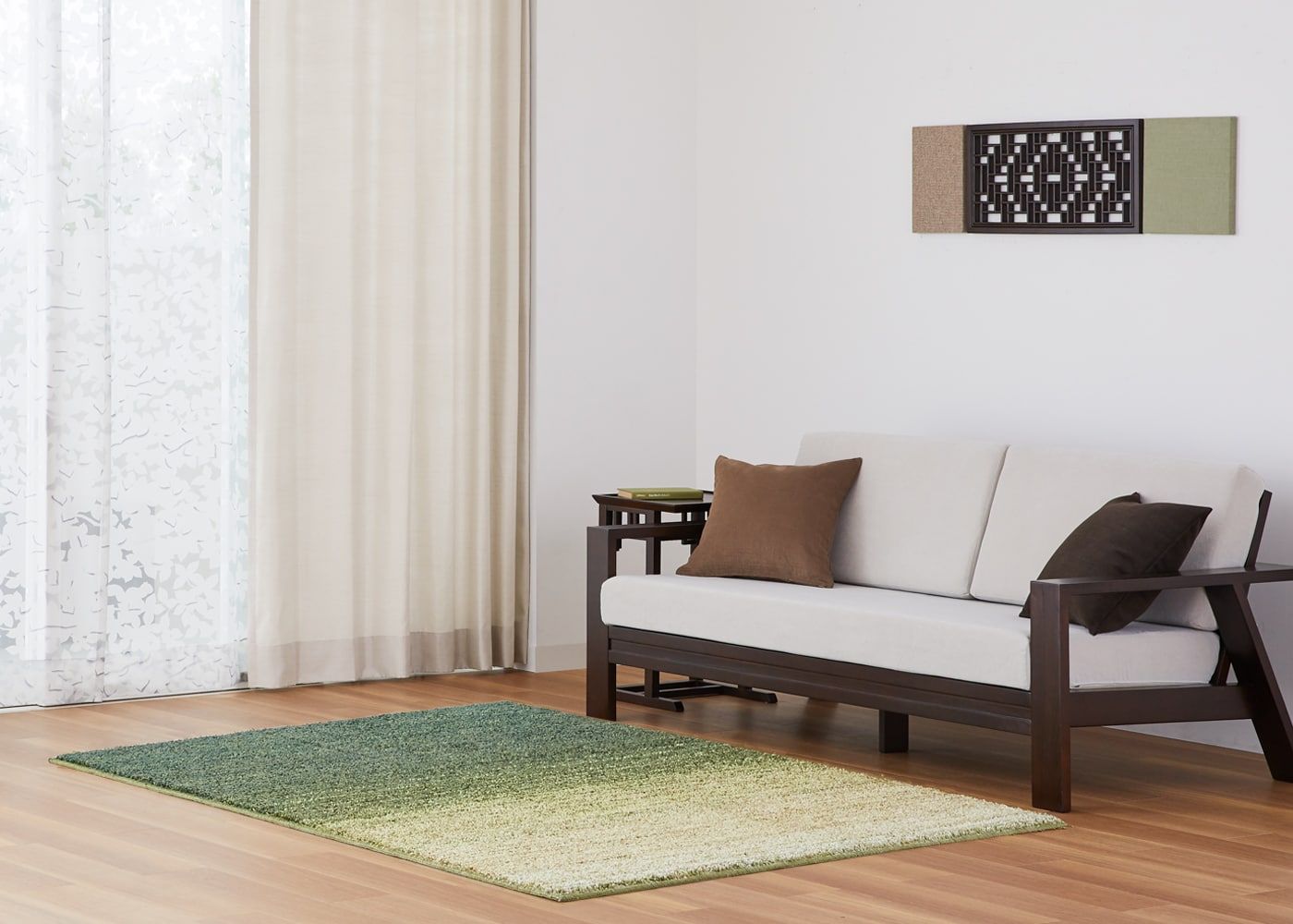 ラグを組み合わせた、ブラウン×グリーンの自然を感じる癒しのコーディネートが際立ちます。(写真はナチュラル ノンタック)