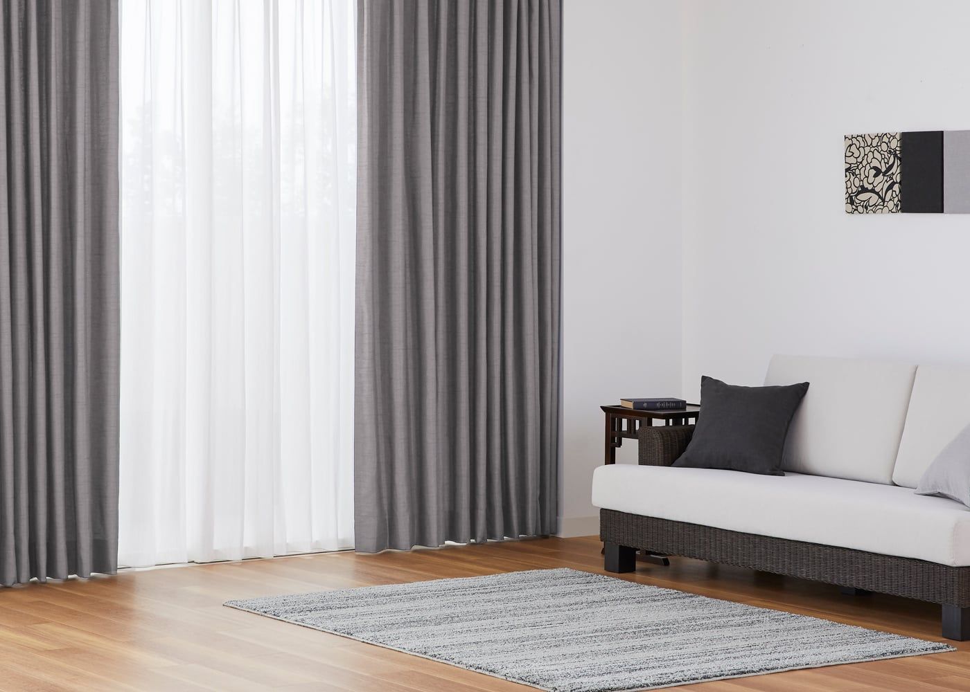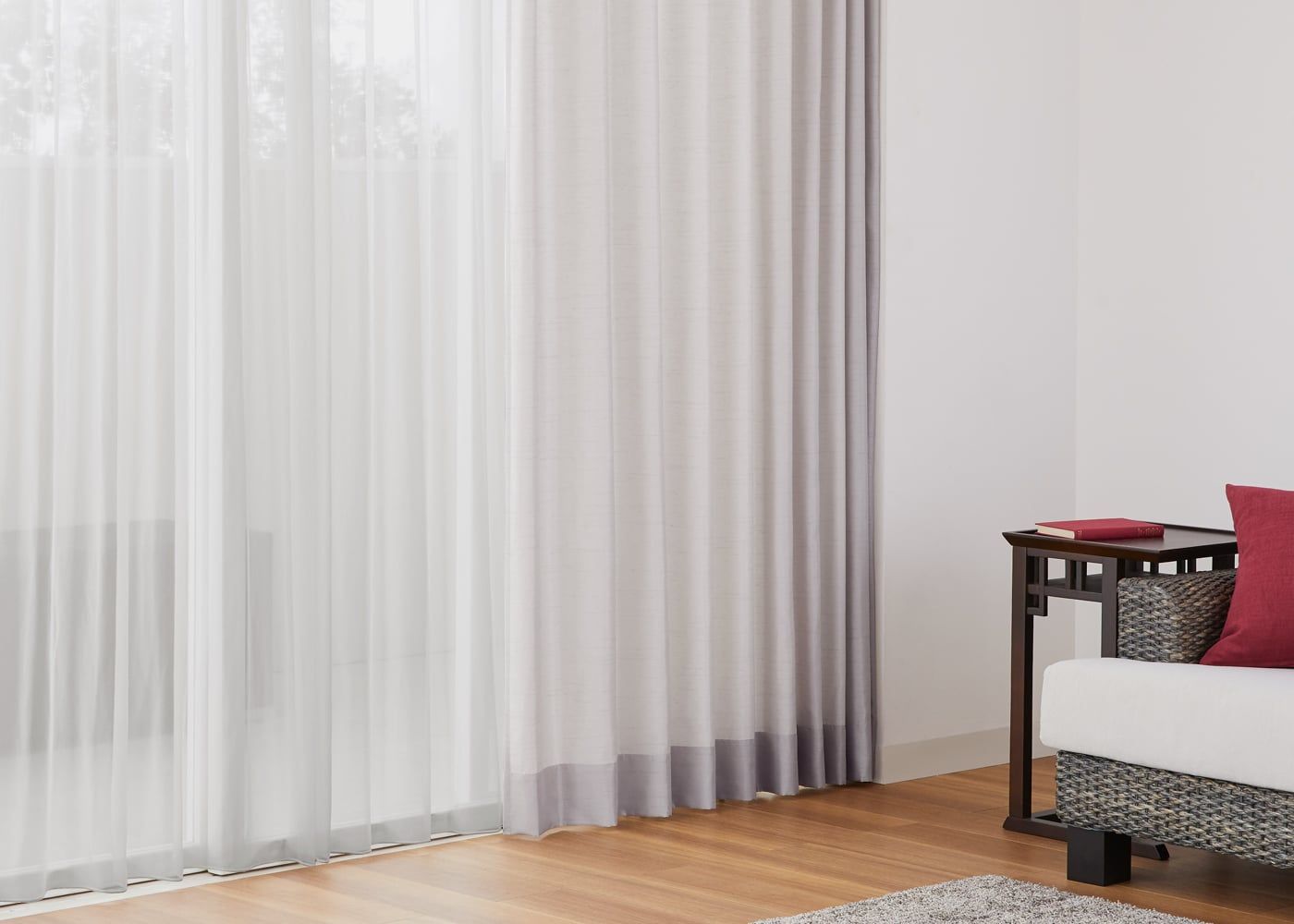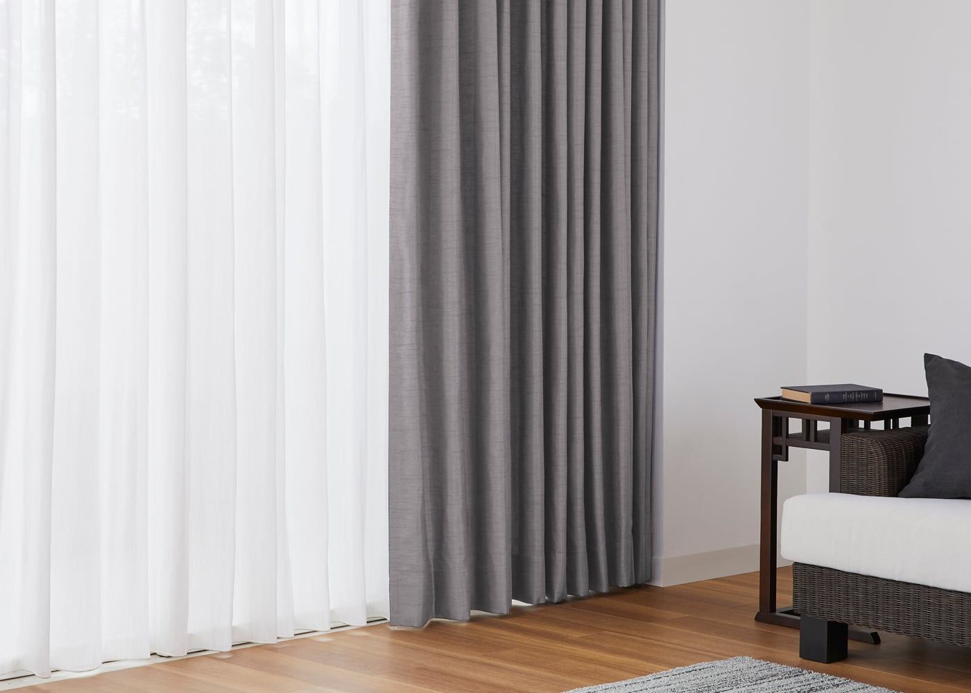 グレーのカーテンに素材感溢れるレースカーテンを組み合わせると、シックな空間にやさしい雰囲気をもたらします。(写真はグレー プリーツ2倍ヒダ。