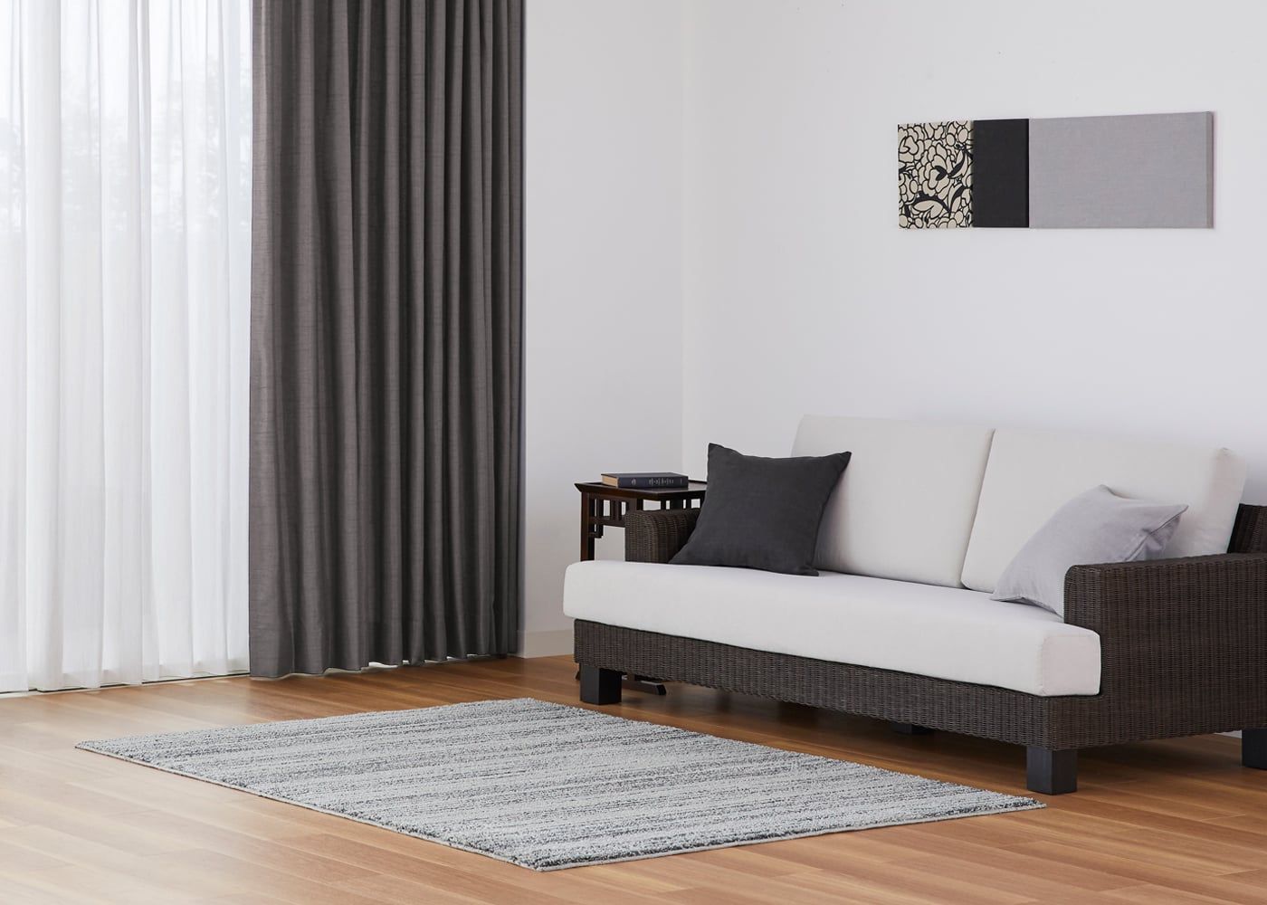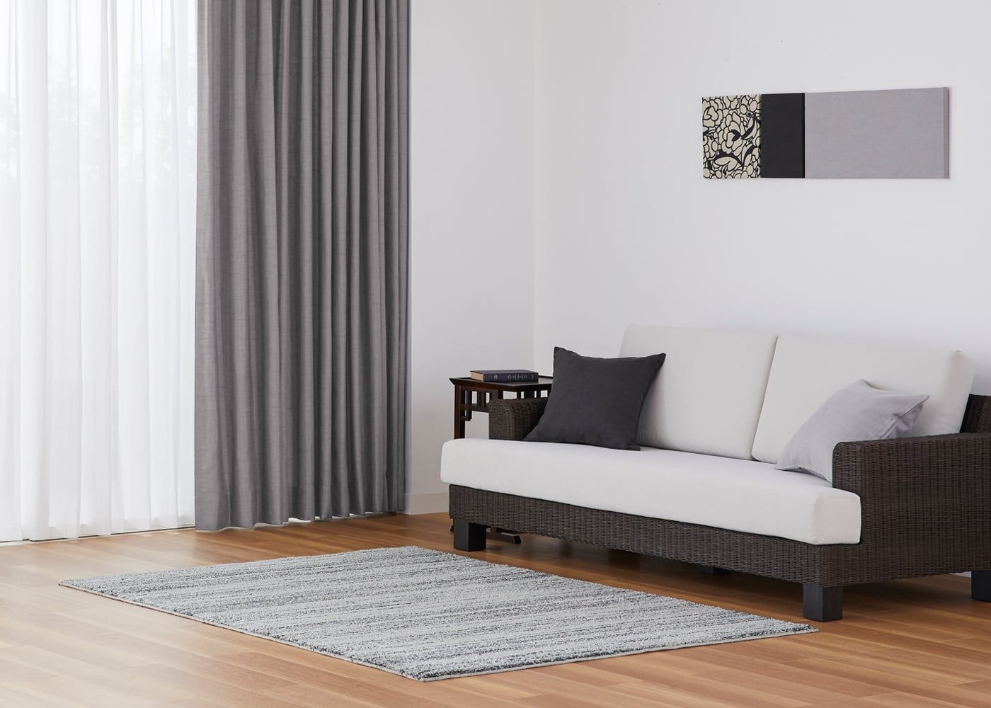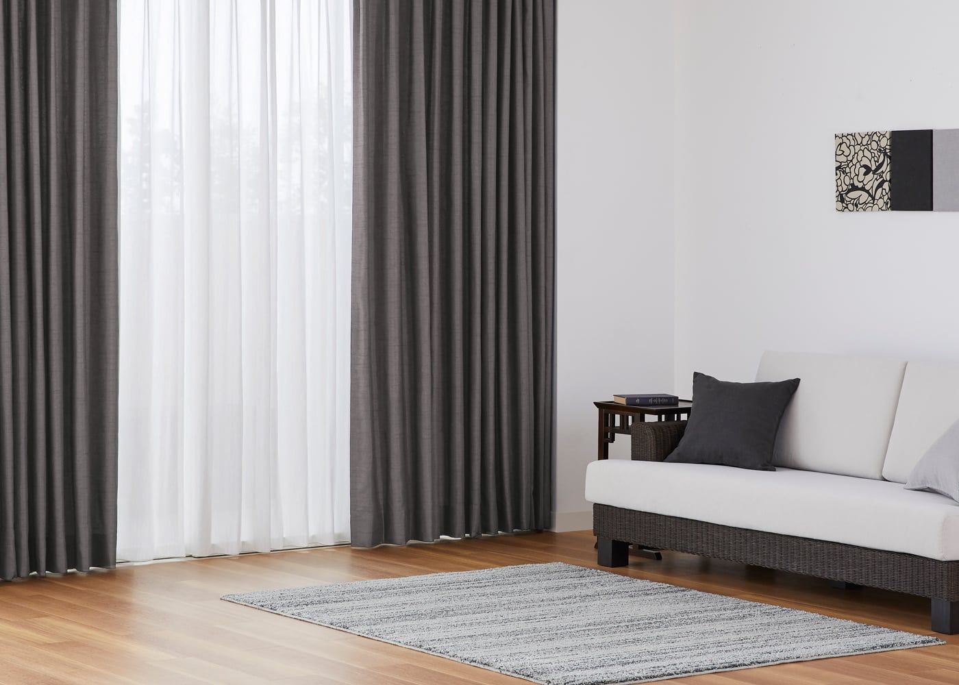 グレーのカーテンに素材感溢れるレースカーテンを組み合わせると、シックな空間にやさしい雰囲気をもたらします。(写真はグレー プリーツ2倍ヒダ。