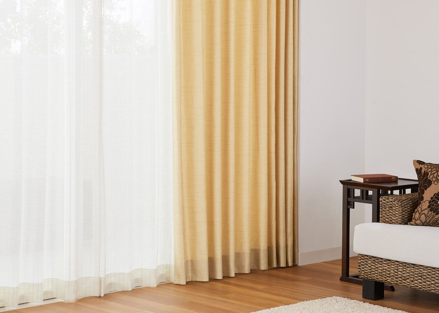 自然の色味と柔らかな風合いが特長のアイボリーのカーテンは、ヒダのないノンタック仕上げでフラットな印象に。レースカーテンの柄を際立たせ、すっきりとした空間を演出します。(写真はアイボリー ノンタック)