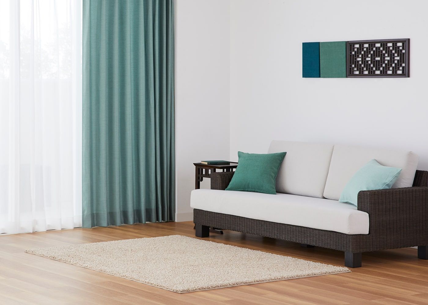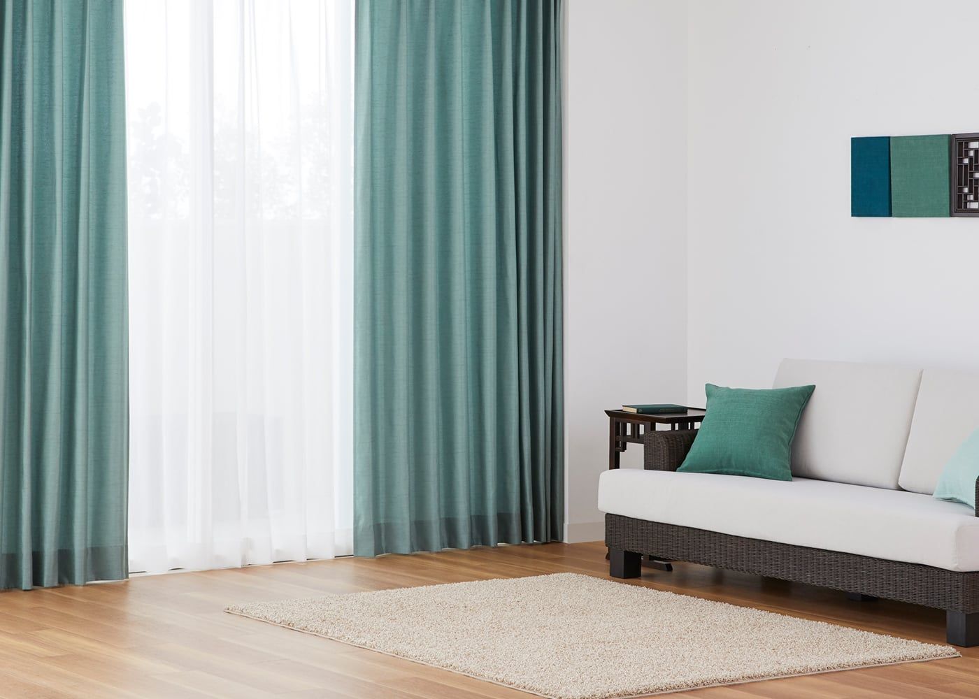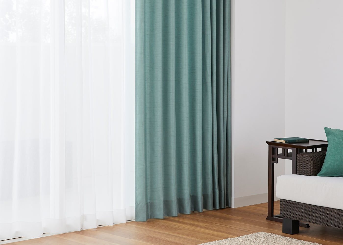 真っ白でプレーンなレースカーテンを合わせると、ドレープカーテンのミントがより引き立ちます。(写真はミント プリーツ1.5倍ヒダ。