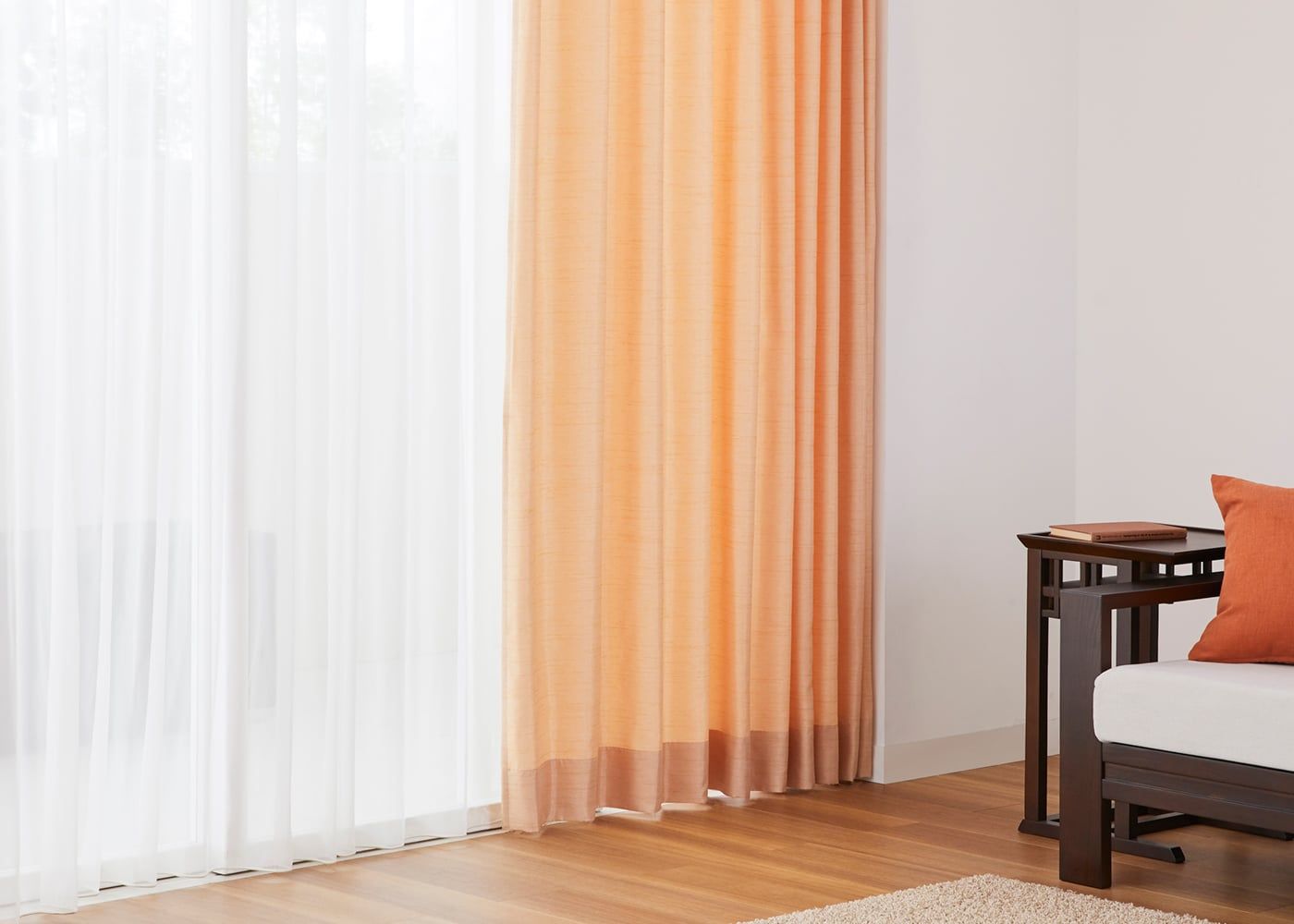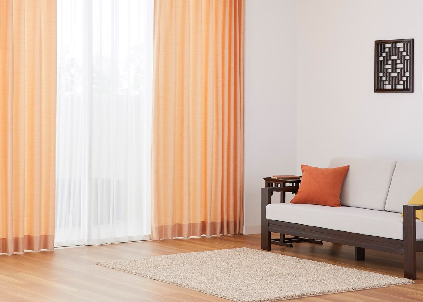 南国ムード溢れるトロピカルな空間を演出するには、ライトオレンジをカーテンに取り入れるのがおすすめです。(写真はライトオレンジ プリーツ1.5倍ヒダ)