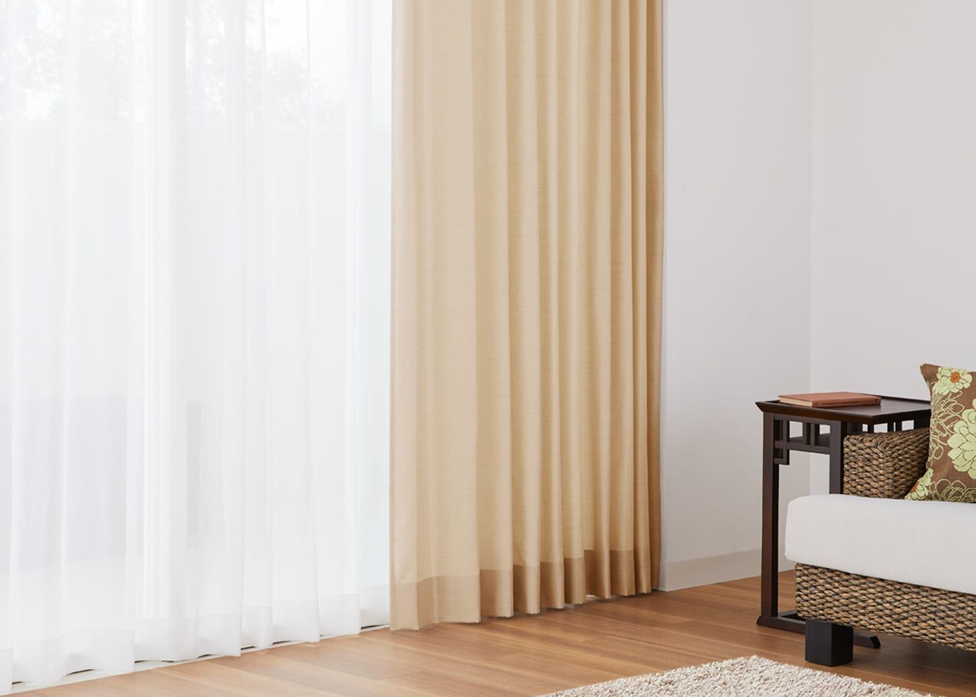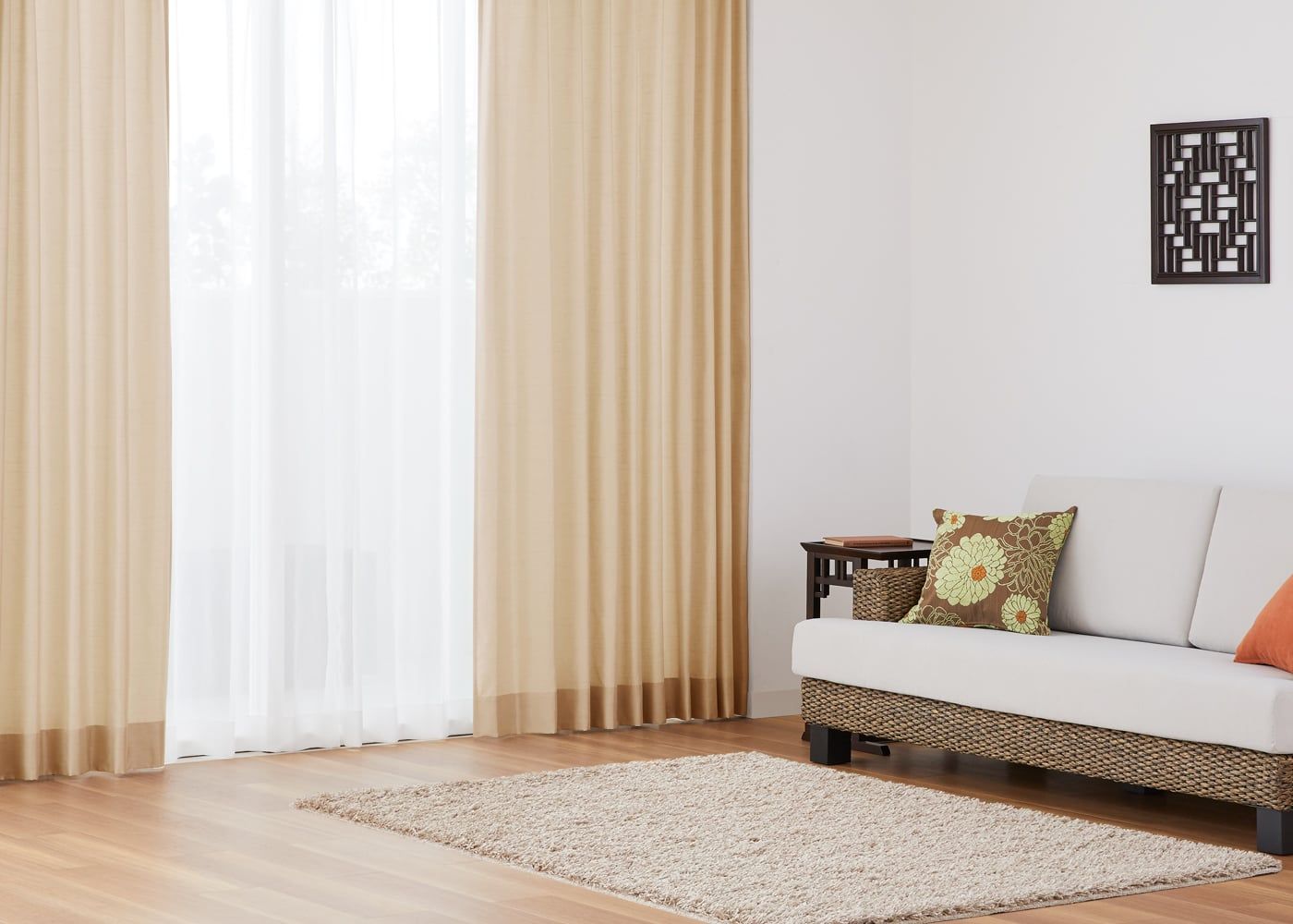 ベージュ系のドレープカーテンにホワイトのレースカーテンを合わせると、より一層明るいお部屋になります。(写真はサンドベージュ プリーツ1.5倍ヒダ。