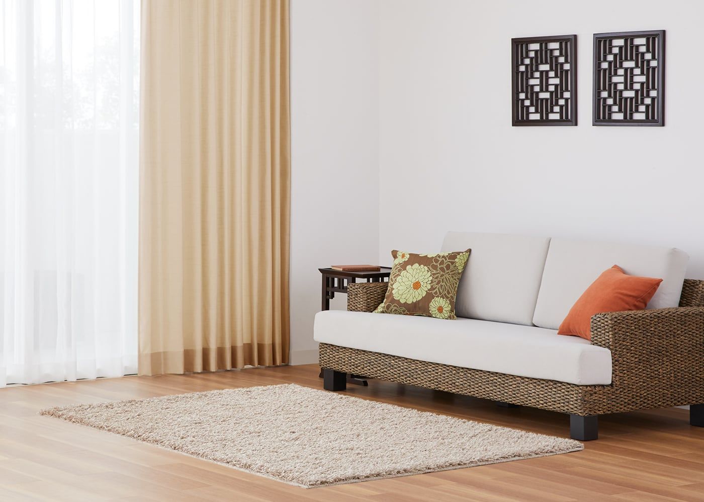 クッションカバーがアクセントのアジアン空間のベースカラーとして活躍します。(写真はサンドベージュ プリーツ1.5倍ヒダ)