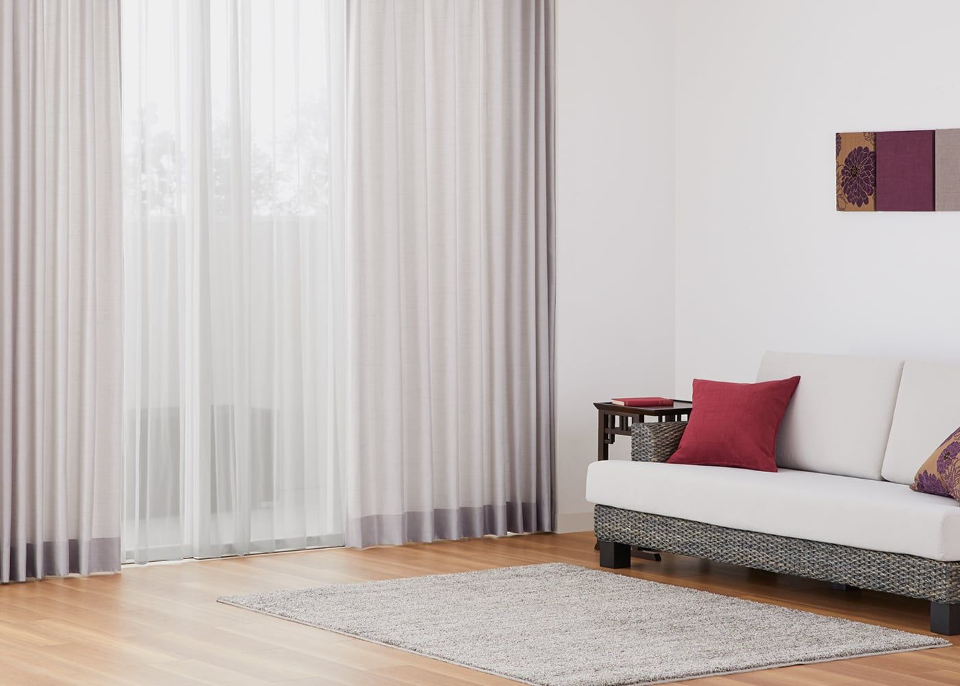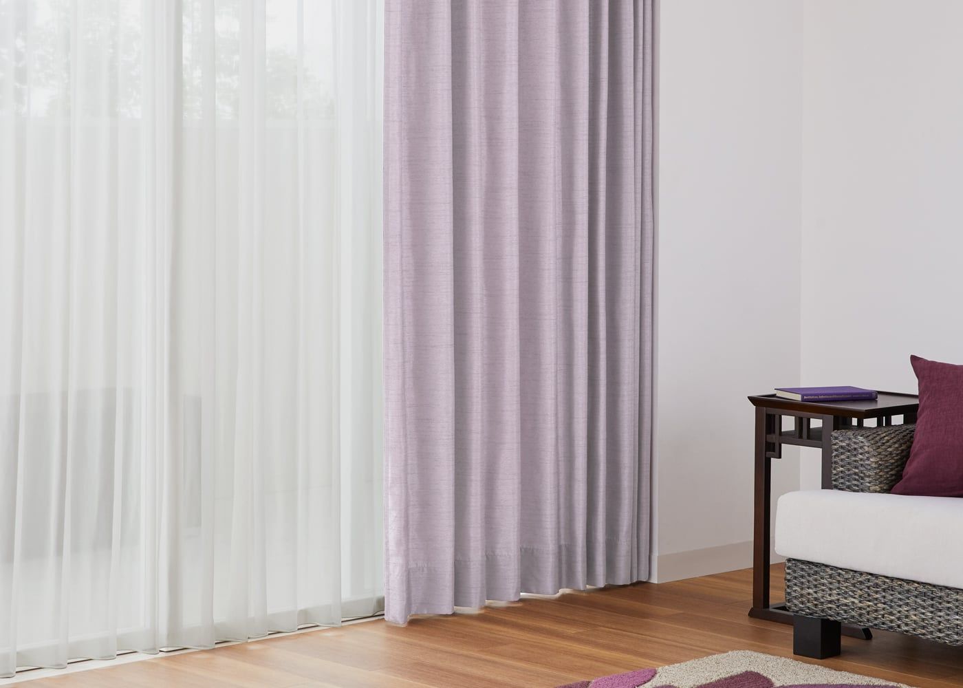 お部屋に上品な印象をプラスしてくれるモーヴ。ラグジュアリーな雰囲気にしたい方におすすめのカラーです。艶のあるカラーとドレープ感がエレガントさを演出します。(写真はモーヴ プリーツ1.5倍ヒダ)