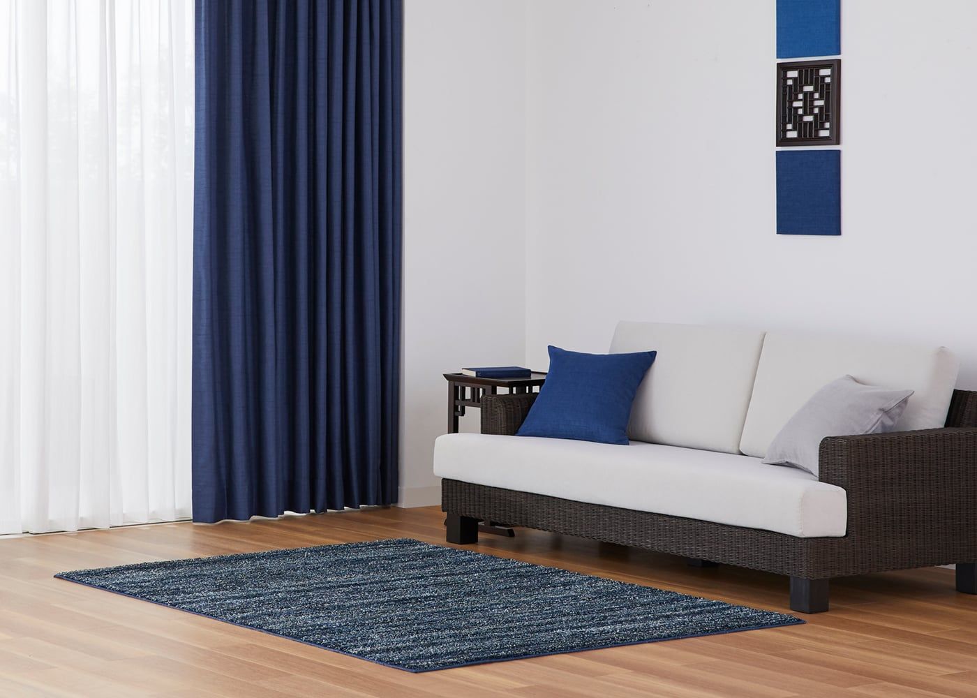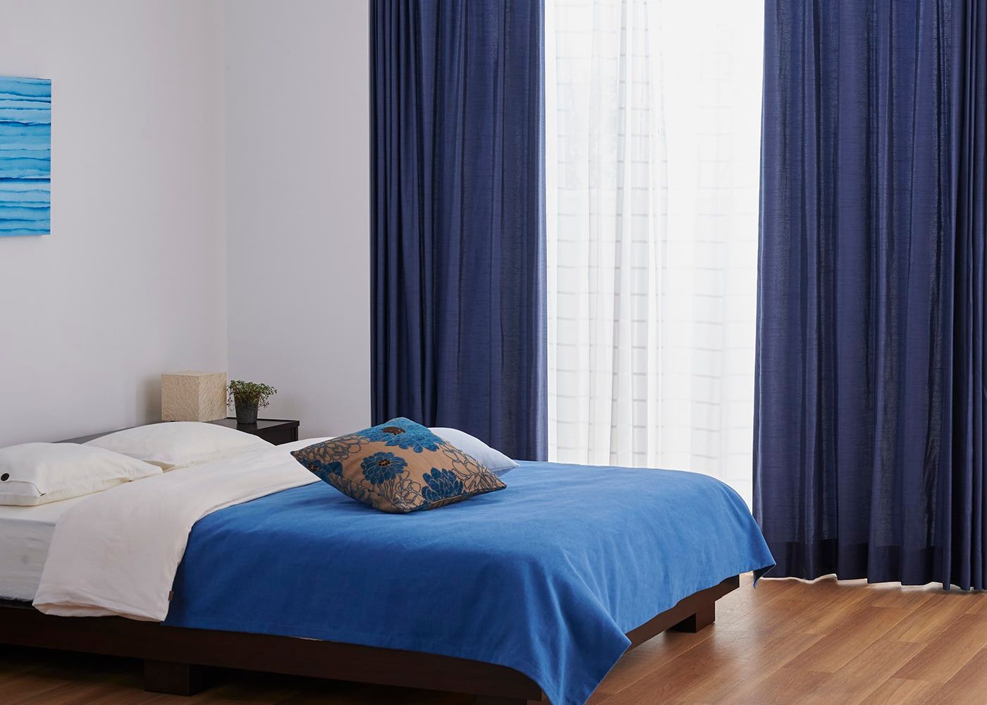 壁面装飾を添えた、深みのある青でまとめたブルーのインテリアで心を落ち着かせてくれる空間を演出してみては。(写真はブルー プリーツ2倍ヒダ)