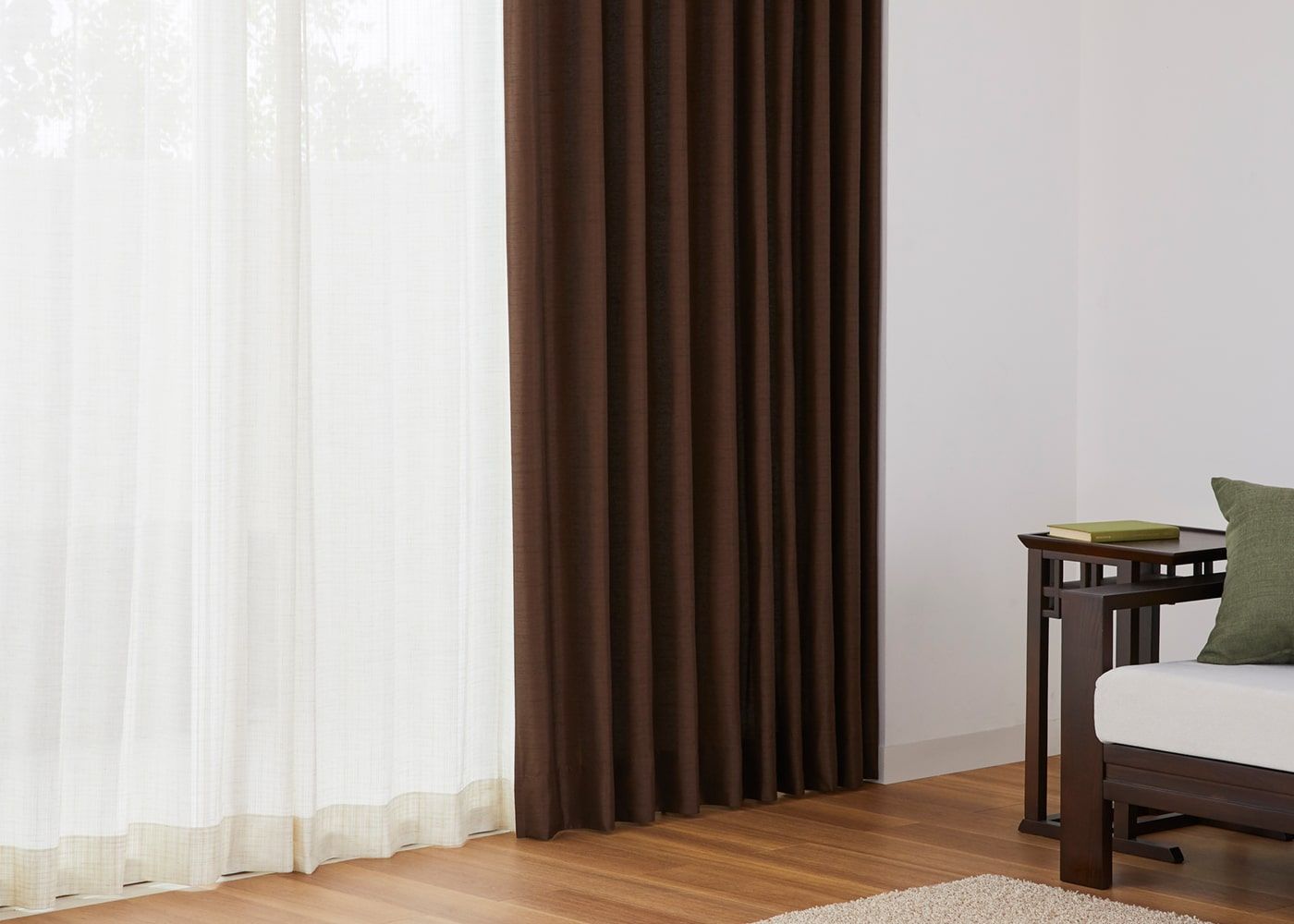 大木を思わせるブラウンのカーテンに、素材感のあるレースカーテンを組み合わせることで、より自然の温もりを感じる空間に仕上がります。(写真はブラウン プリーツ1.5倍ヒダ。