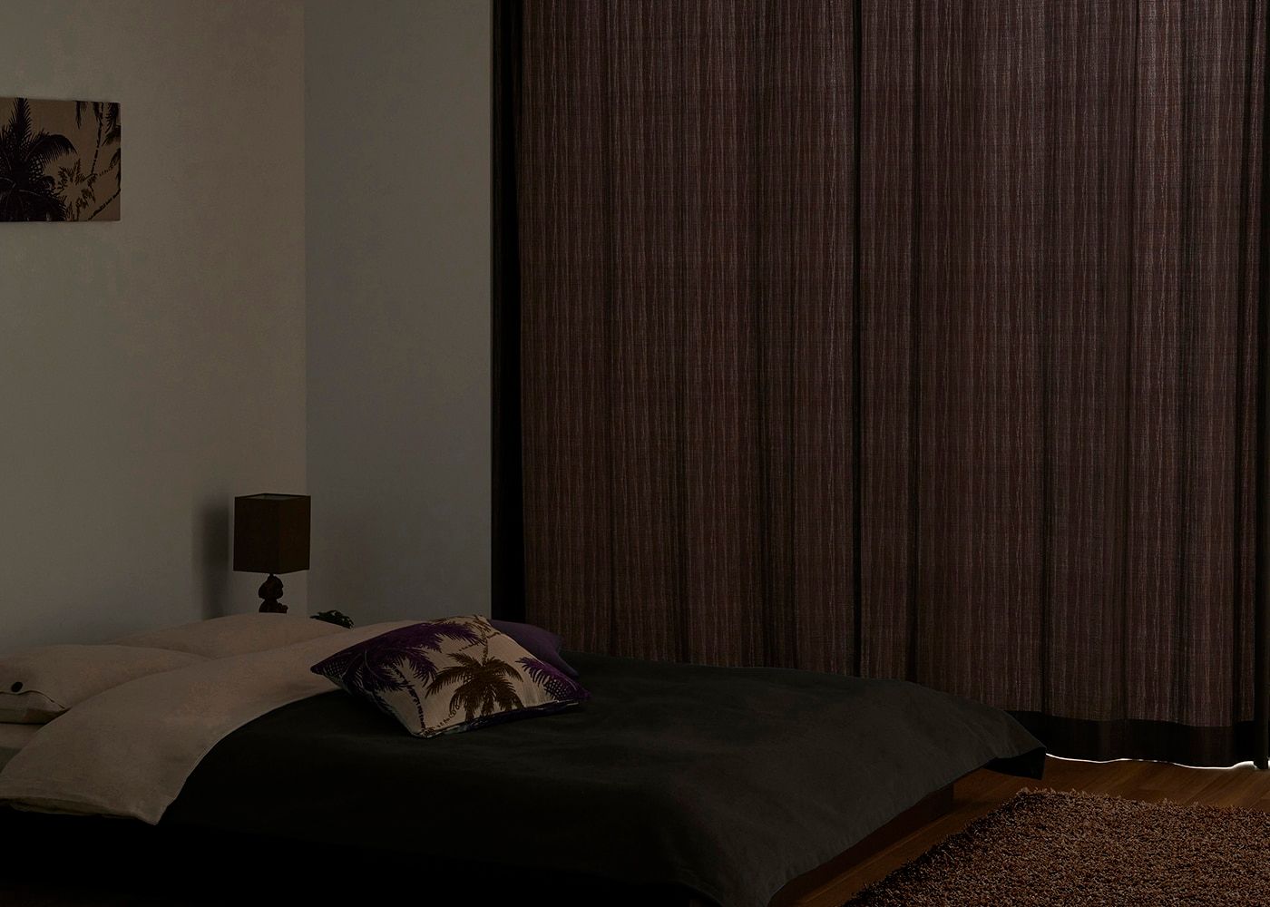 バークは生地が厚いため、遮光カーテンのように室内への光を遮ってくれます。(写真はダークブラウン ノンタック。室内照明OFF。)