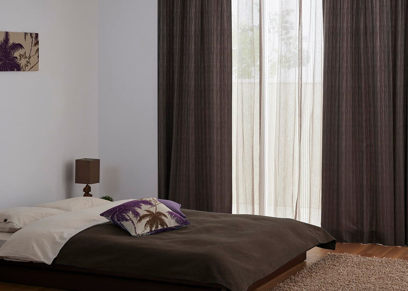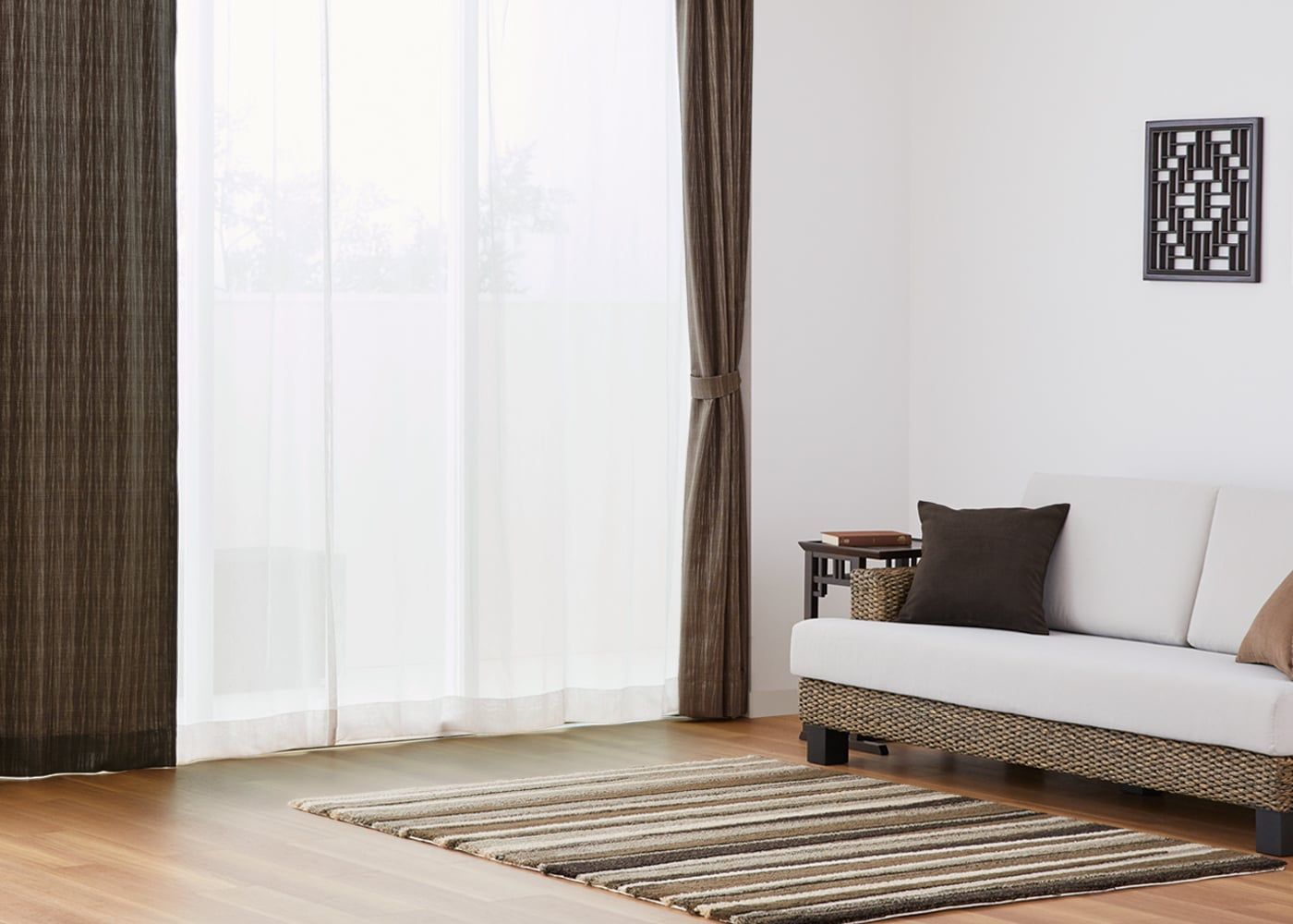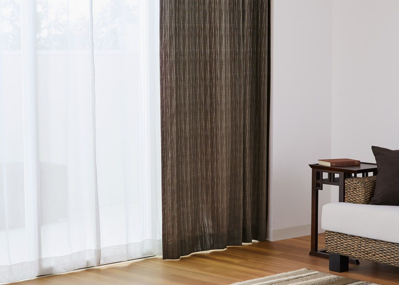 シックで深みのあるダークブラウンのドレープカーテンに、真っ白なレースカーテンを組み合わせると、空間にメリハリをつけながらも明るい雰囲気にしてくれます。(写真はダークブラウン ノンタック。