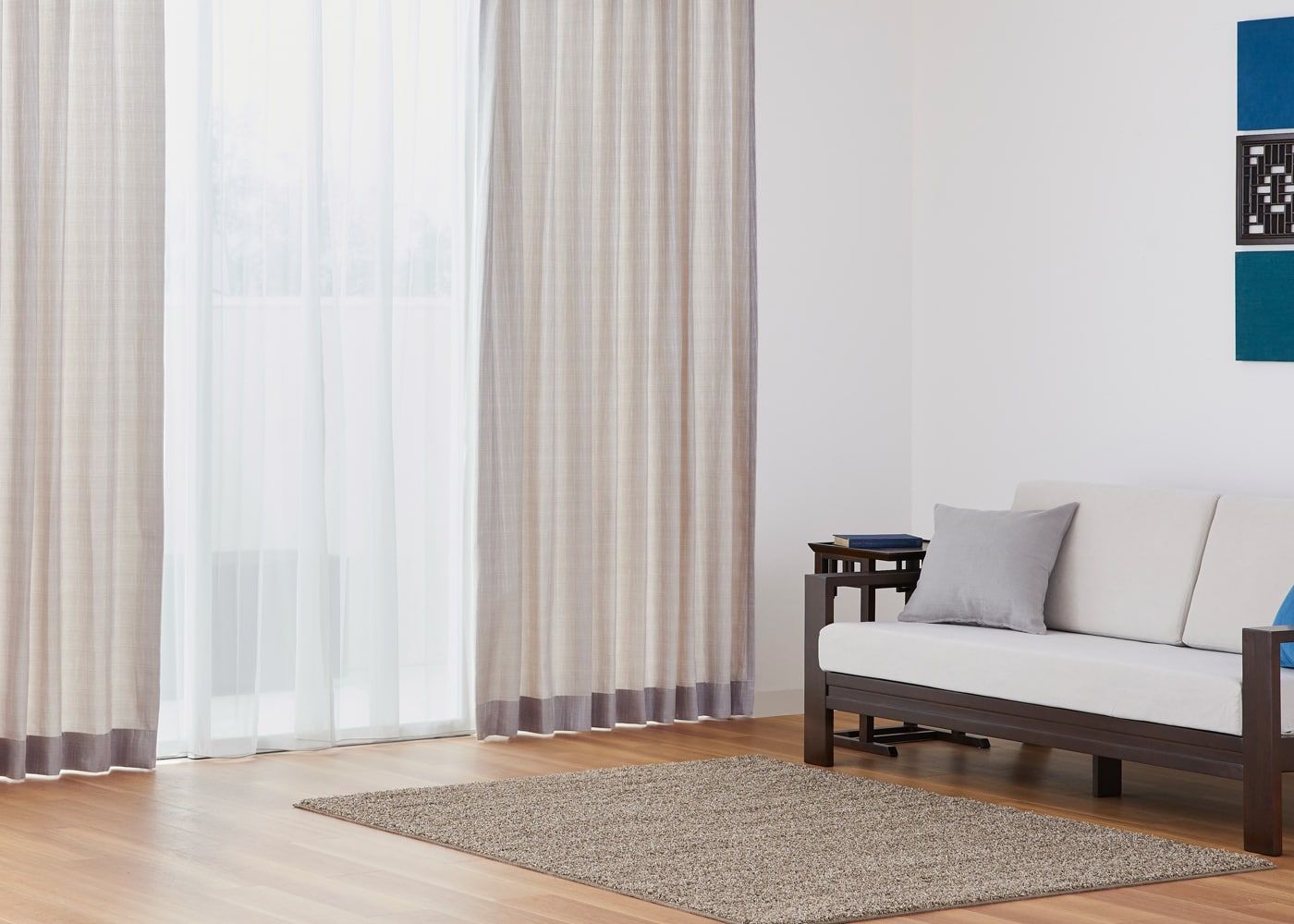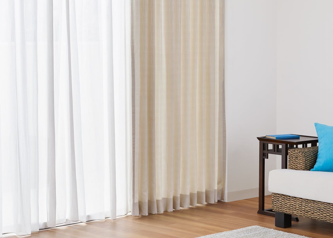 カーテンを閉じることで空間の雰囲気が変わります。やわらかな素材の風合いが空間全体に調和をもたらし、一体感のある部屋づくりが叶います。(写真はベージュ ノンタック、室内照明ON)