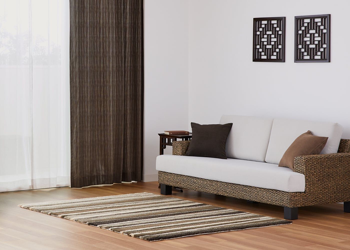 ノンタックはヒダを作らず、生地の表情や柄を活かせるシンプルなカーテン。どんな空間にもなじみやすく、使用生地が少ないため手頃な価格で注文可能です。(写真はダークブラウン ノンタック)